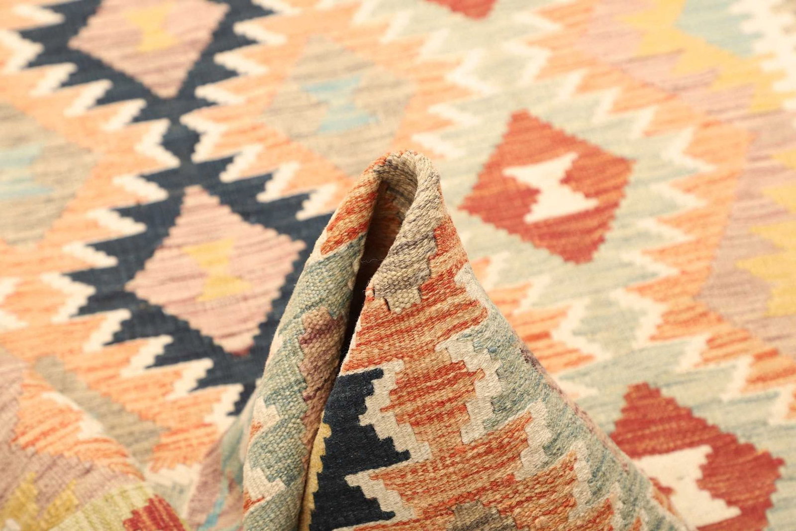 Der Kelim Teppich besteht aus hochwertiger Schurwolle. Schurwolle ist bekannt für ihre Langlebigkeit und Widerstandsfähigkeit, was diesen Teppich zu einem idealen Begleiter in stark frequentierten Räumen macht. Die handgewebte Technik sorgt dafür, dass jeder Teppich ein Unikat ist, das über Generationen hinweg geschätzt werden kann. Die Verwendung von Wolle verleiht dem Teppich zudem einen weichen Griff und sorgt für ein angenehmes Laufgefühl.