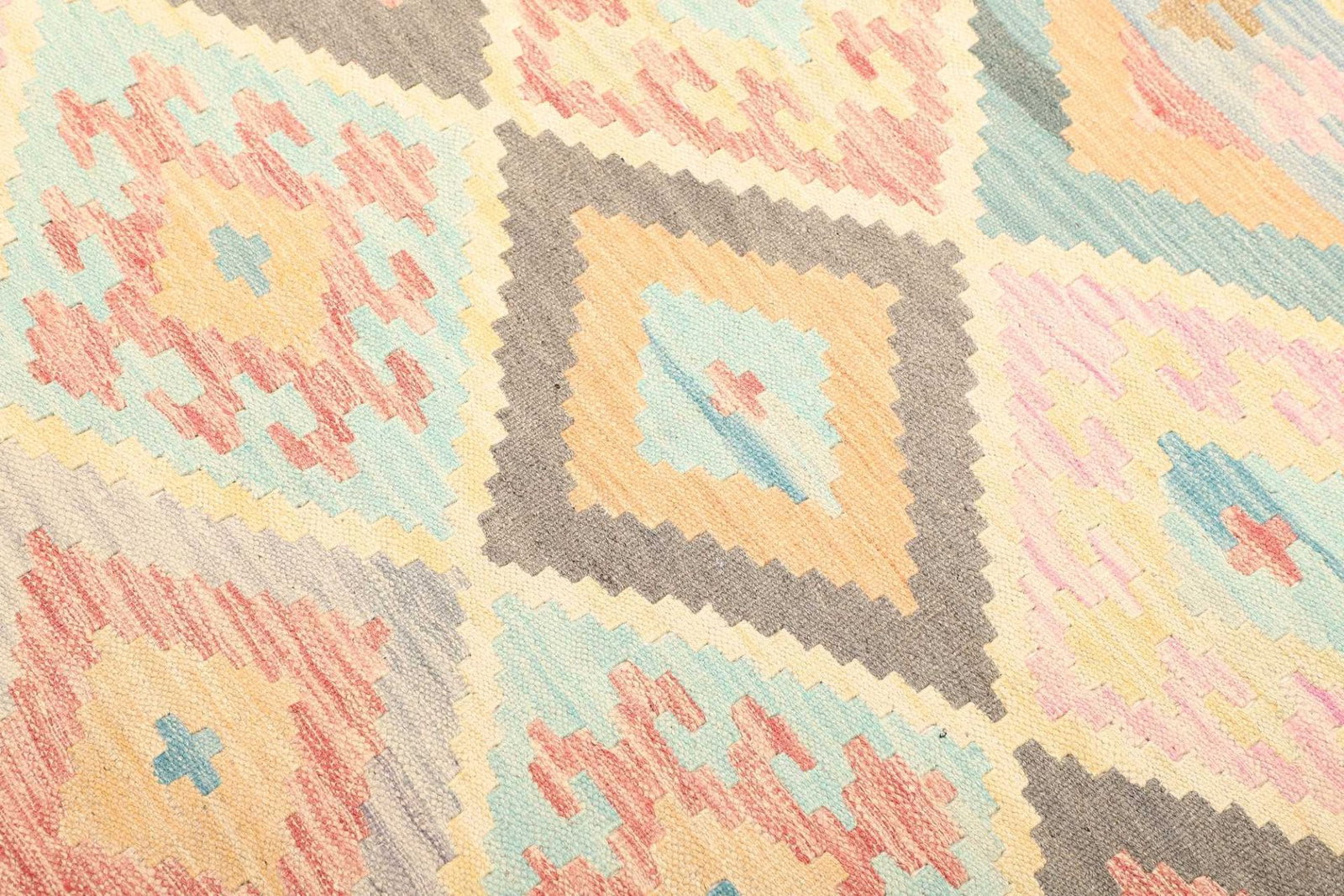 Die Farben, die zur Herstellung des Kelim verwendet werden, sind meist erdige Töne, die die Natur widerspiegeln, und reichen von tiefem Rot und Blau bis hin zu sanften Gelbtönen. Diese Palette ermöglicht es, den Teppich sowohl in modernen als auch in traditionellen Innenräumen zu integrieren.