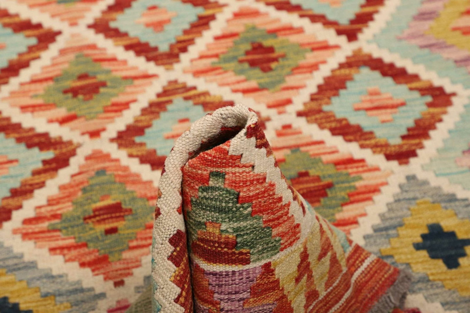 Der Kelim Teppich ist aus 100% hochwertiger Wolle gefertigt, die für ihre Langlebigkeit und Widerstandsfähigkeit bekannt ist. Wolle bietet nicht nur eine hervorragende Wärmeisolierung, sondern auch eine natürliche Schmutzresistenz, was den Teppich besonders pflegeleicht macht. Die handgewebte Methode garantiert zudem, dass jeder Teppich ein Unikat ist, das die Liebe zum Detail und die Handwerkskunst der Teppichweber widerspiegelt.