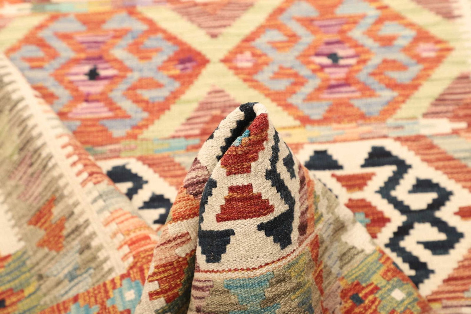 Der Teppich besteht aus reiner Schurwolle, einem Material, das bekannt ist für seine hervorragenden Eigenschaften. Schurwolle ist sowohl weich als auch robust, was sie ideal für den täglichen Gebrauch macht. Der handgewebte Herstellungsprozess sorgt dafür, dass jeder Teppich ein individuelles Kunstwerk ist. Mit sorgfältiger Handarbeit und traditionalen Techniken gefertigt, überzeugt dieser Kelim Teppich durch seine hohe Knotendichte und die Stabilität der Struktur.