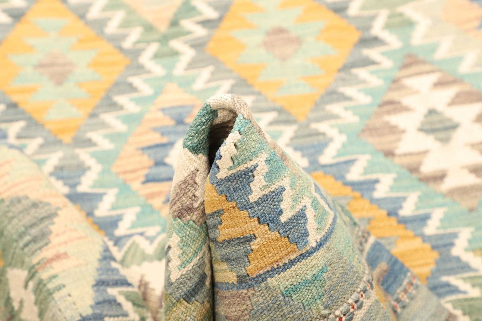 Der Kelim Teppich ist aus reiner Wolle handgewebt, was ihm nicht nur seine Langlebigkeit verleiht, sondern auch eine weiche und angenehme Haptik. Wolle hat die hervorragende Eigenschaft, sowohl isolierend als auch atmungsaktiv zu sein, sodass der Teppich in jeder Jahreszeit ein komfortables Laufgefühl bietet. Die handgewebte Technik sorgt dafür, dass jedes Stück ein Unikat ist. Dies hebt die exzellente Qualität des Teppichs hervor und garantiert, dass Sie ein authentisches Stück traditioneller Kunst in Ihrem Zuhause haben.