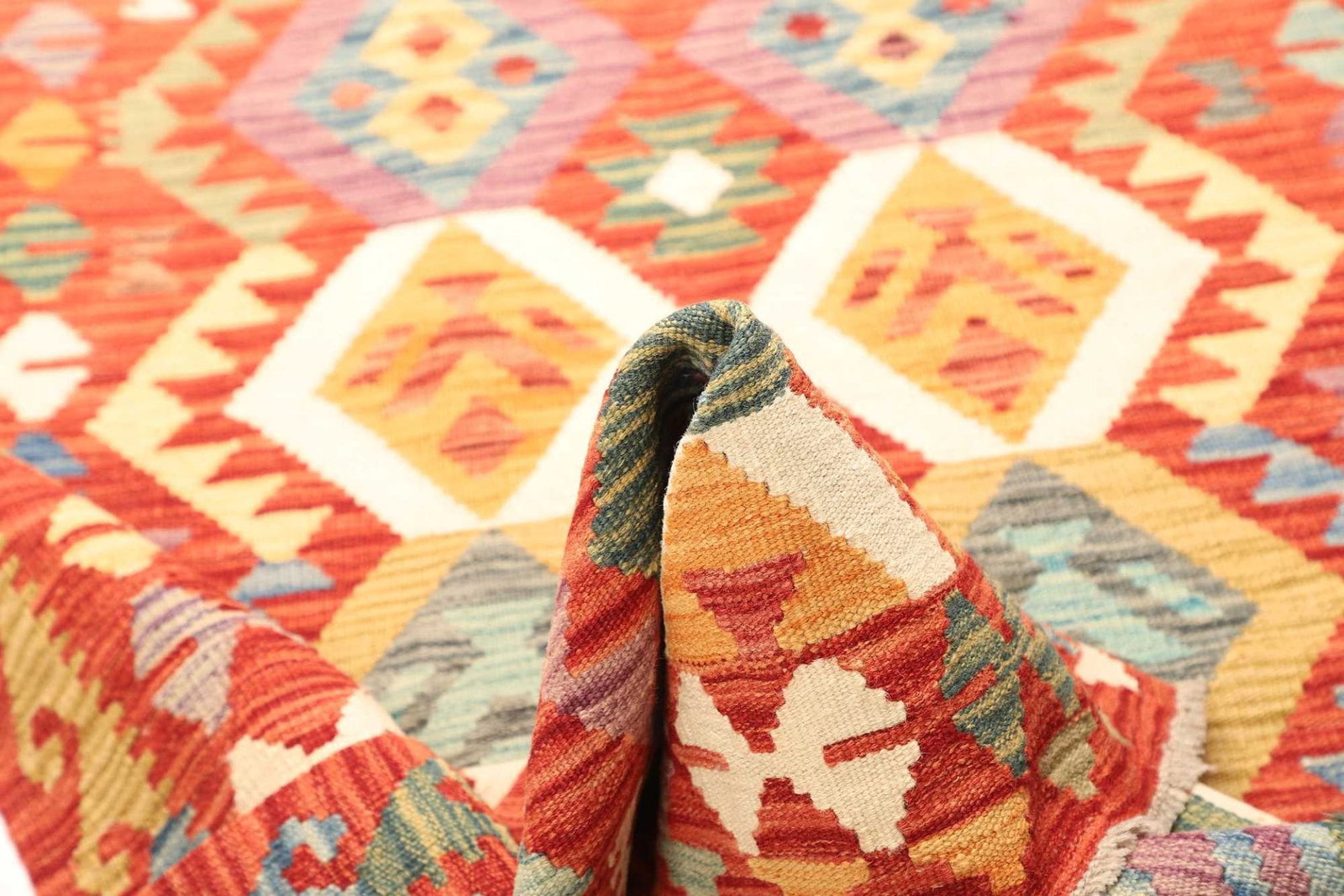 Der Kelim Teppich hat seine Wurzeln in den traditionellen Teppichwebereien des Orients. Obwohl im Titel kein spezifisches Land genannt wird, können wir die reiche Geschichte und Tradition der Orientteppiche hervorheben. Diese Teppiche finden ihren Ursprung in verschiedenen Regionen, wie der Türkei, Iran und Afghanistan, wo das Weben von Teppichen über Generationen weitergegeben wird.