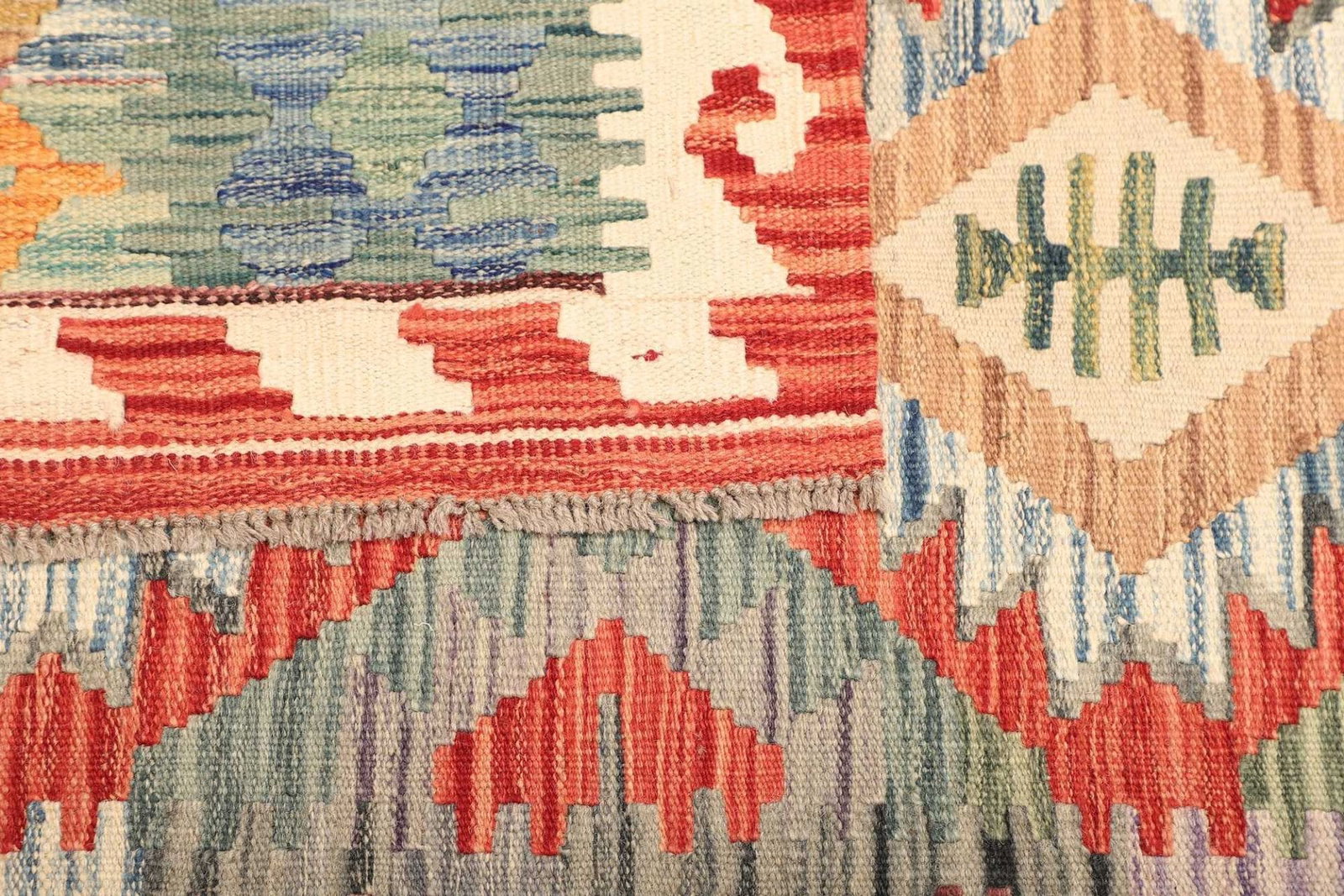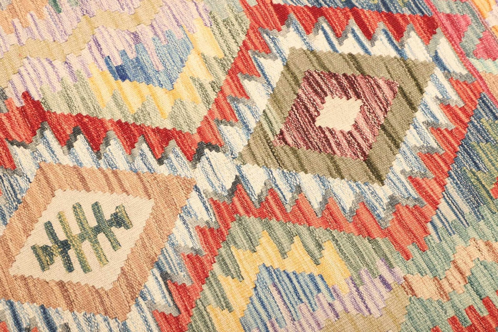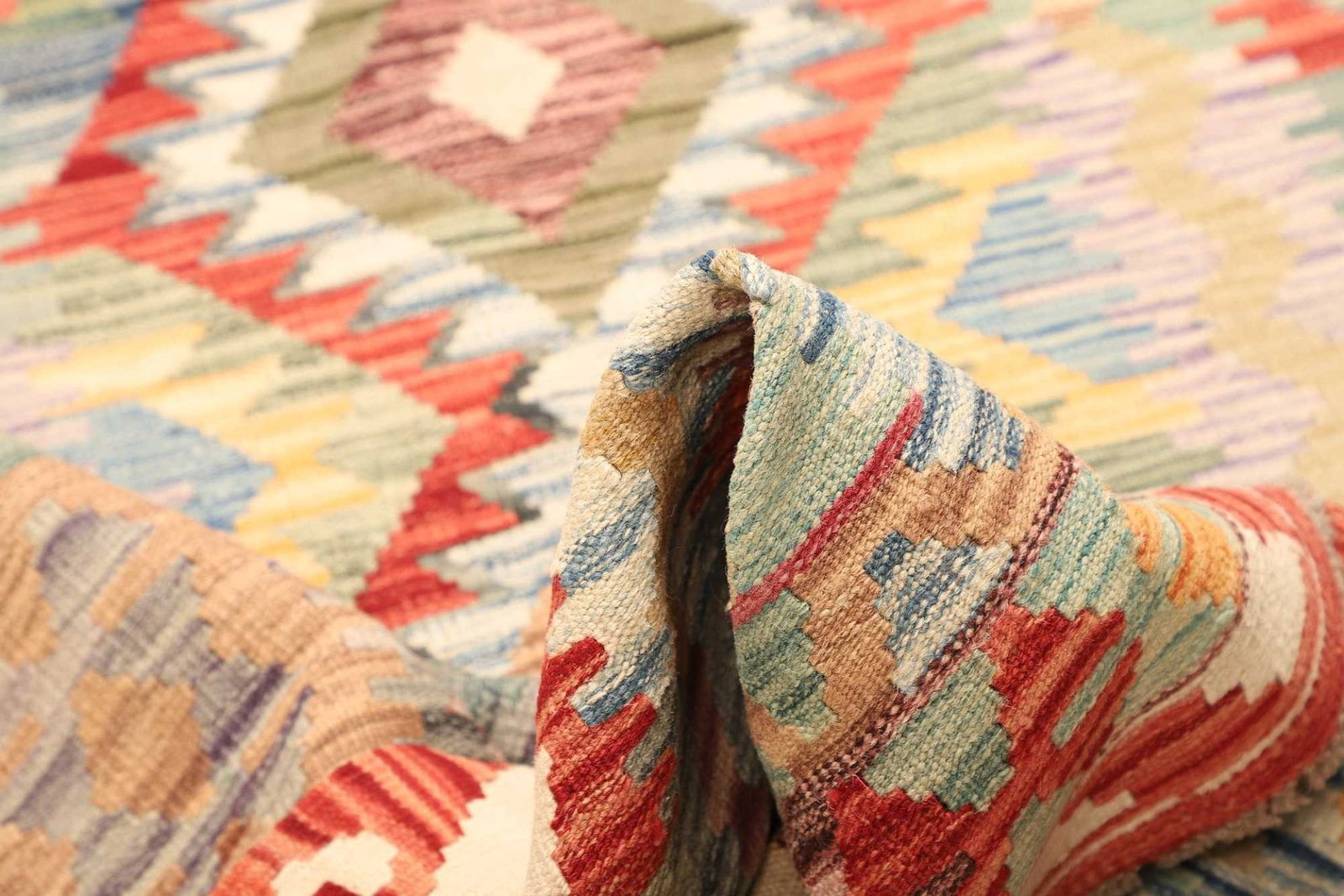 Der Kelim Teppich besteht aus hochwertiger Schurwolle, einem Material, das besonders für Teppiche geschätzt wird. Schurwolle ist nicht nur strapazierfähig und widerstandsfähig, sondern auch von Natur aus schmutzabweisend. Das macht Ihr Zuhause zu einem hygienischen und einladenden Ort. Die handgewebte Technik verleiht dem Teppich zusätzlich eine außergewöhnliche Struktur, die sich in den unterschiedlichen Schattierungen und Mustern widerspiegelt. Die Knotendichte dieses Teppichs ist darauf ausgelegt, sowohl optische als auch haptische Akzente zu setzen.