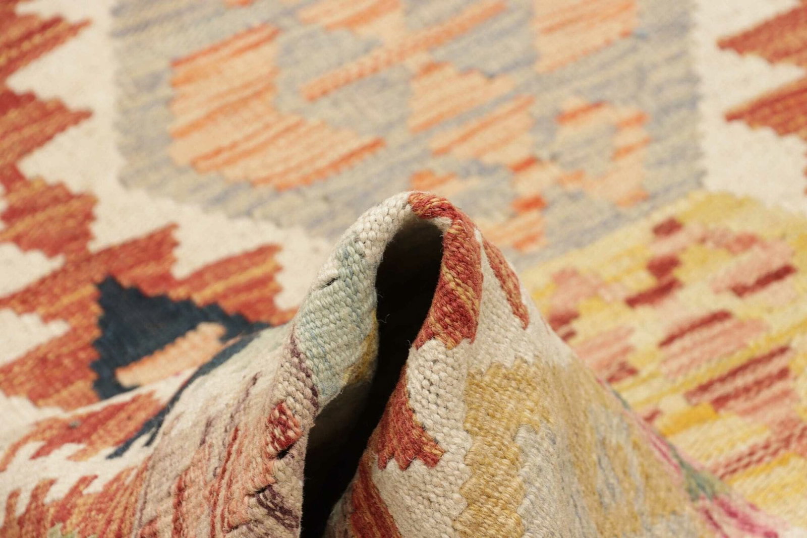 Die Verwendung von Schurwolle erhöht nicht nur die Lebensdauer des Teppichs, sondern sorgt auch für eine angenehme Fußwärme und ein ansprechendes Laufgefühl. Seine Pflegeleichtigkeit und Langlebigkeit machen diesen handgewebten Kelim Teppich zu einer ausgezeichneten Wahl für jeden, der Wert auf Qualität und Ästhetik legt.