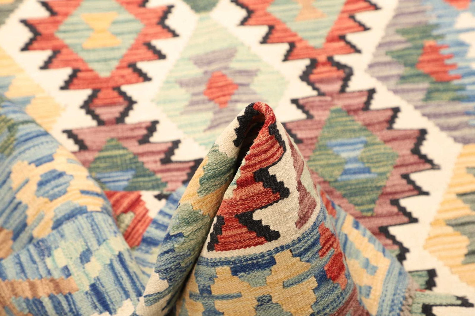 Echte handgewebte Kelim Teppiche zeichnen sich durch Unebenheiten und unterschiedliche Knotendichten aus, was auf handwerkliche Fertigung hinweist. Prüfen Sie zusätzlich das Material. Hochwertige Schurwolle fühlt sich weich an und hat einen leichten Glanz. Fragen Sie im Zweifel den Händler nach Zertifikaten oder Herkunftsnachweisen.