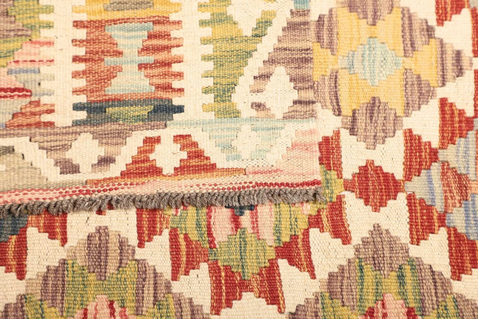 Die Wahl der Wolle als primäres Material macht diesen Kelim Teppich besonders strapazierfähig und pflegeleicht. Wolle hat von Natur aus schmutzabweisende Eigenschaften, was sie zur idealen Wahl für stark beanspruchte Räume macht. Darüber hinaus sorgt die handgewebte Technik dafür, dass der Teppich eine hohe Knotendichte aufweist, was sich positiv auf die Strapazierfähigkeit und Langlebigkeit auswirkt. Die sorgfältige Verarbeitung garantiert, dass der Teppich sowohl ästhetisch ansprechend als auch funktional ist.