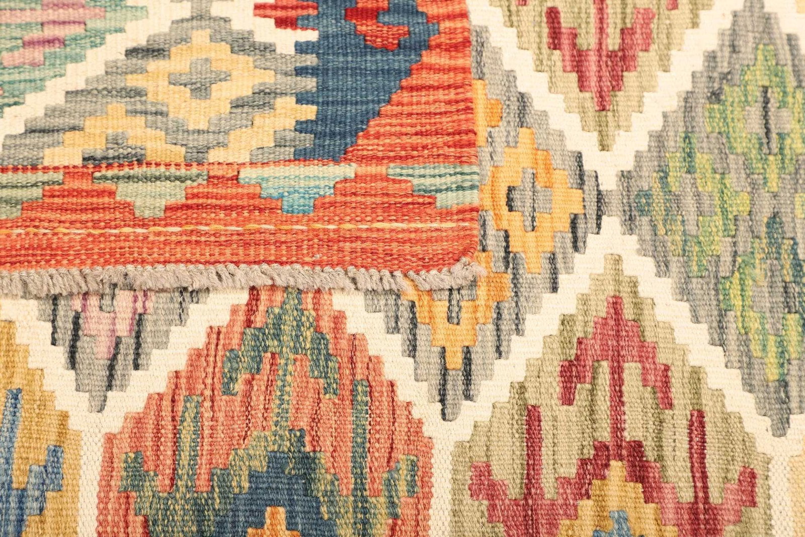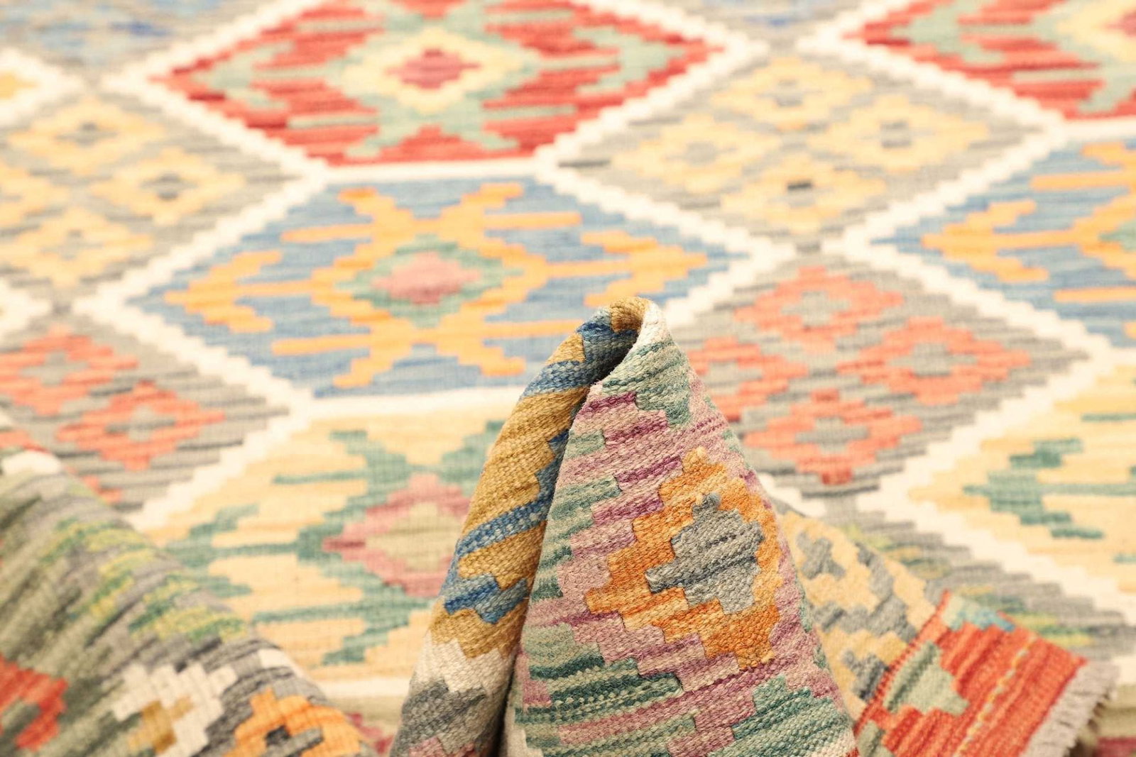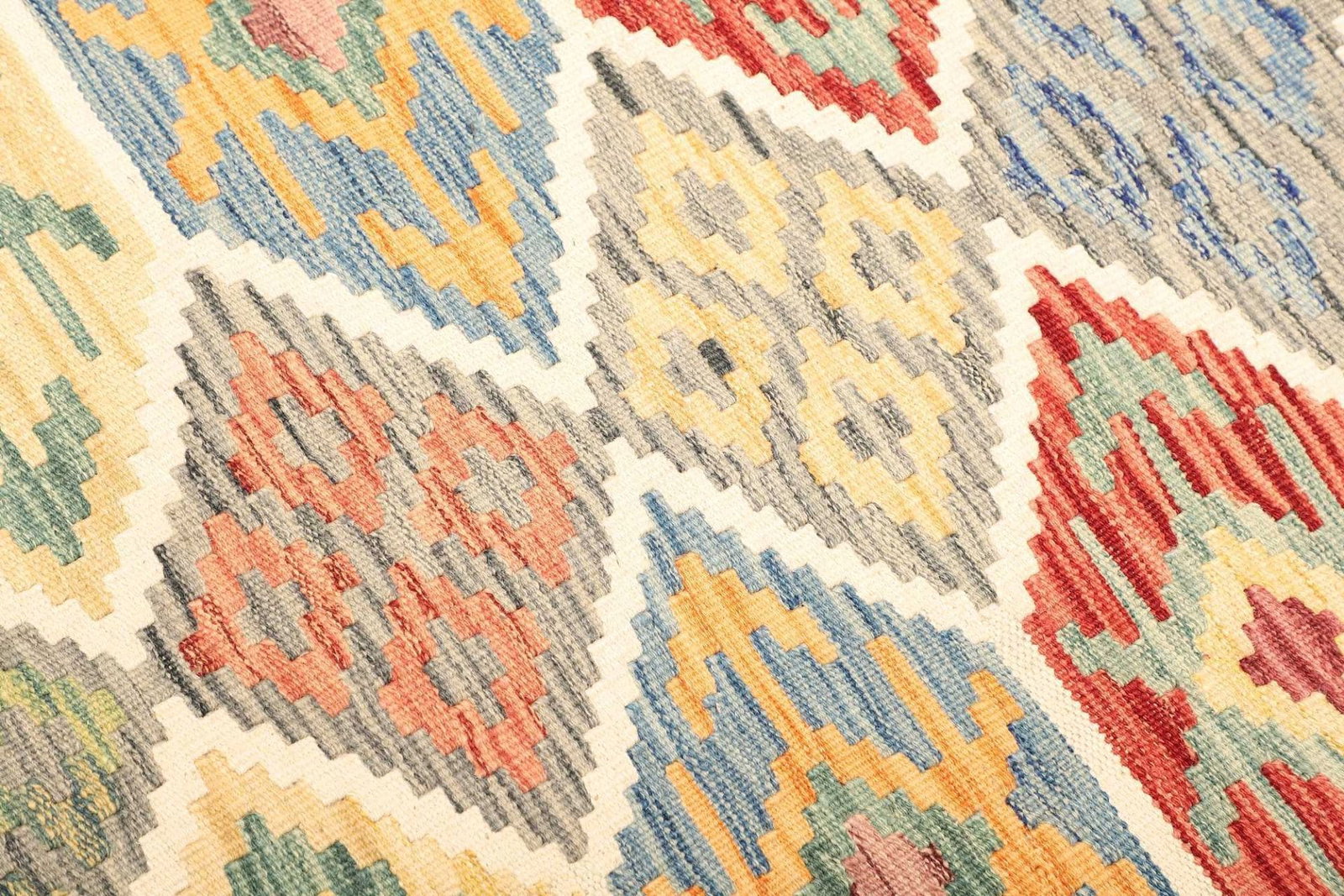 Die Handwebtechnik, die bei der Herstellung dieses Kelim Teppichs angewendet wurde, verleiht ihm eine unvergleichliche Struktur und Flexibilität. Die spezielle Technik sorgt dafür, dass der Teppich gleichzeitig robust und weich ist, was ihn perfekt für den täglichen Einsatz macht. Diese Teppiche zeichnen sich zudem durch eine besondere Knotendichte aus, die den hohen Qualitätsstandard widerspiegelt. Außerdem ist er in einem hervorragenden Zustand, was bedeutet, dass er eine gute Wahl für Liebhaber von Handarbeiten und traditionellem Design ist.