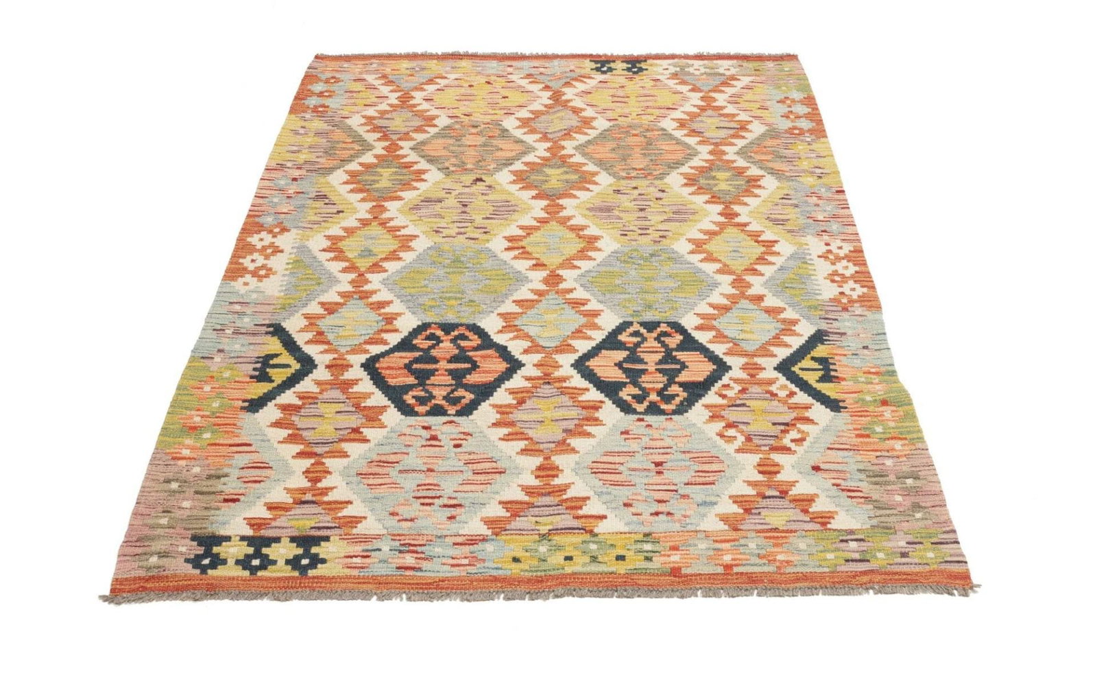 407$Ursprünglicher Preis war: 407$330$Aktueller Preis ist: 330$Kelim Teppich | Knotendichte: ca. 200.000 Knoten/m² | Flor: 100% Schurwolle | Kette: 100% Baumwolle | Größe: 129 x 181 cm | Herkunft: Pakistan | Handgewebte Qualität | Dünner Flor für rustikales Flair