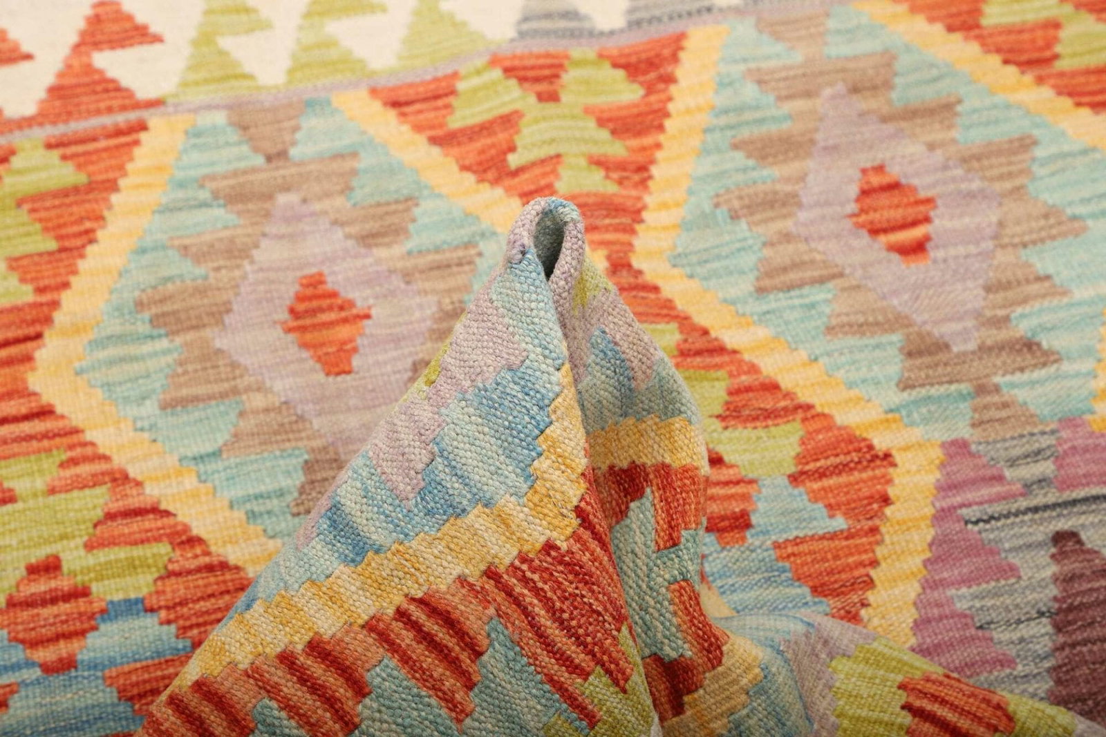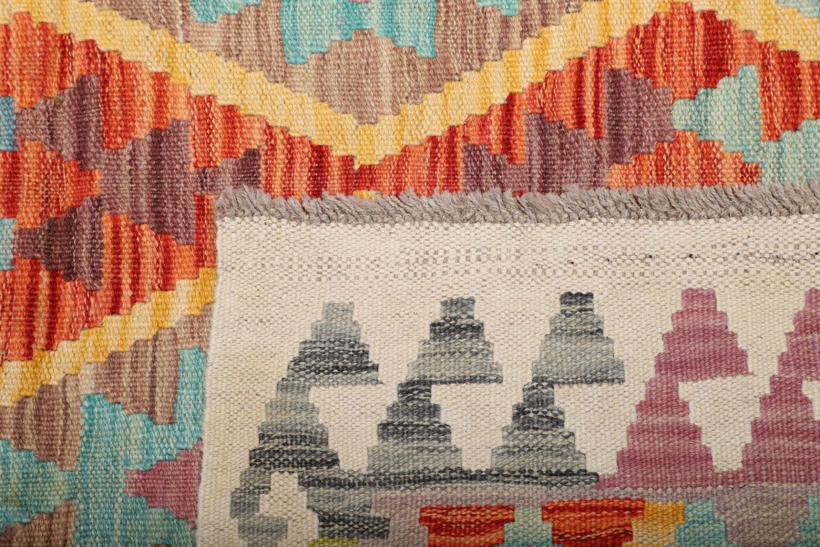Der Kelim Teppich wird aus natürlichen Fasern hergestellt, die nicht nur umweltfreundlich sind, sondern auch eine herausragende Langlebigkeit bieten. Die Handwebtechnik, die für die Herstellung dieses Teppichs verwendet wird, garantiert eine hohe Knotendichte. Dies sorgt für eine widerstandsfähige Struktur, die auch intensiven Gebrauch standhält. Die Oberflächenstruktur ist glatt und sanft, was den Teppich besonders angenehm macht, sowohl barfuß als auch in Kombination mit Schuhen.