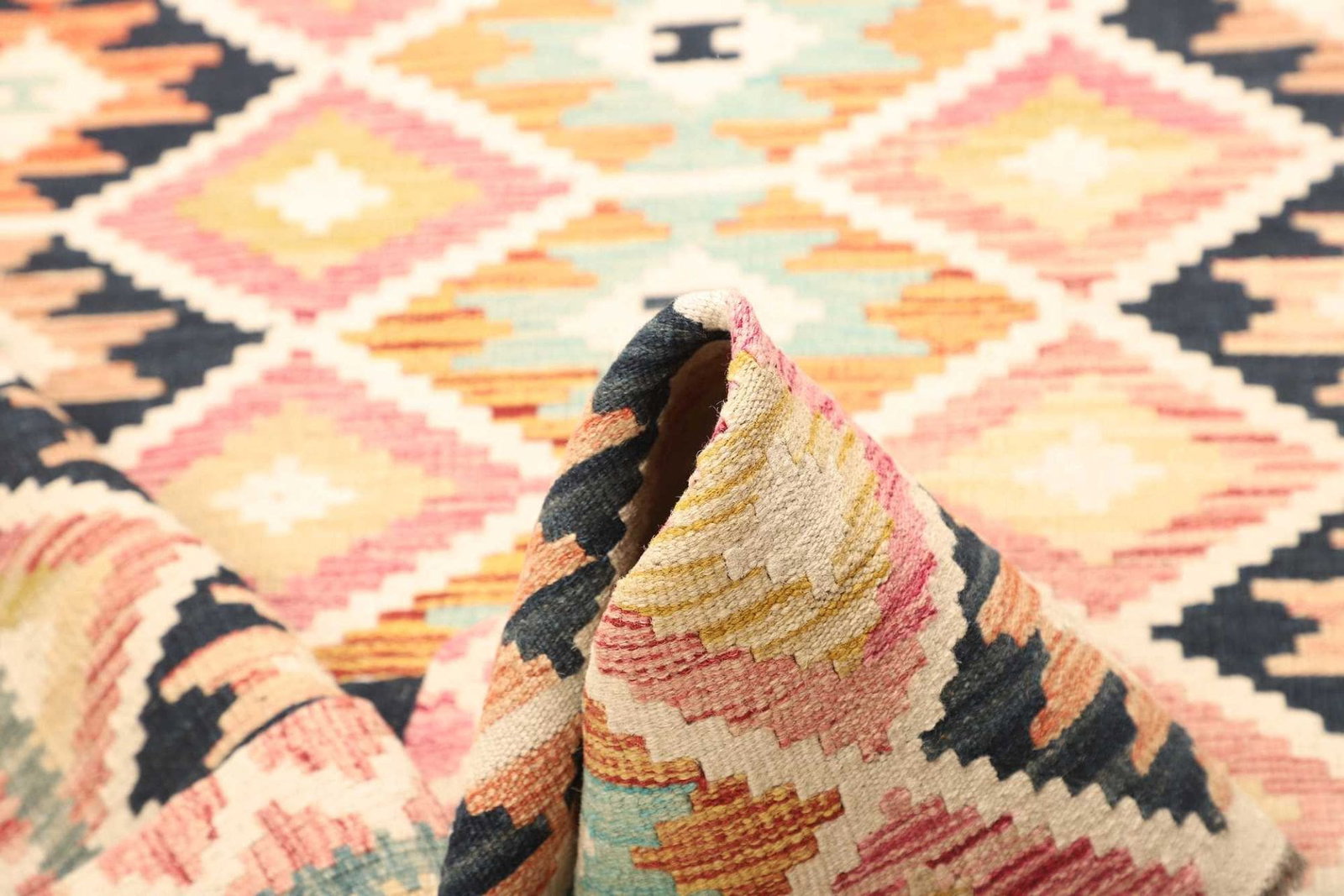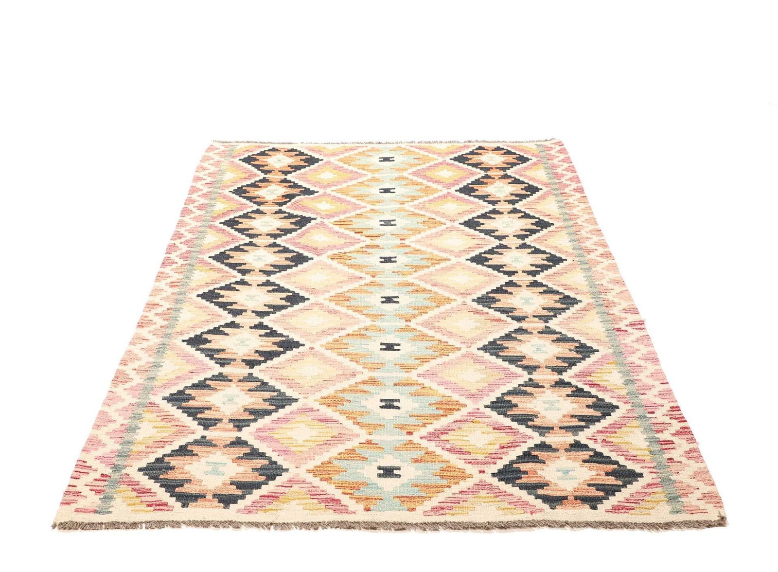 Handgewebter Kelim | Herkunft: Pakistan | Knotendichte: ca. 200.000 Knoten/m² | Flor: 100% Schurwolle | Kette: 100% Baumwolle | Höhe: ca. 5 mm | Größe: 130 x 178 cm | Vielseitig einsetzbar: Ideal als Teppich, Vorhang oder Wandschmuck | Rustikales Flair für moderne Wohnräume