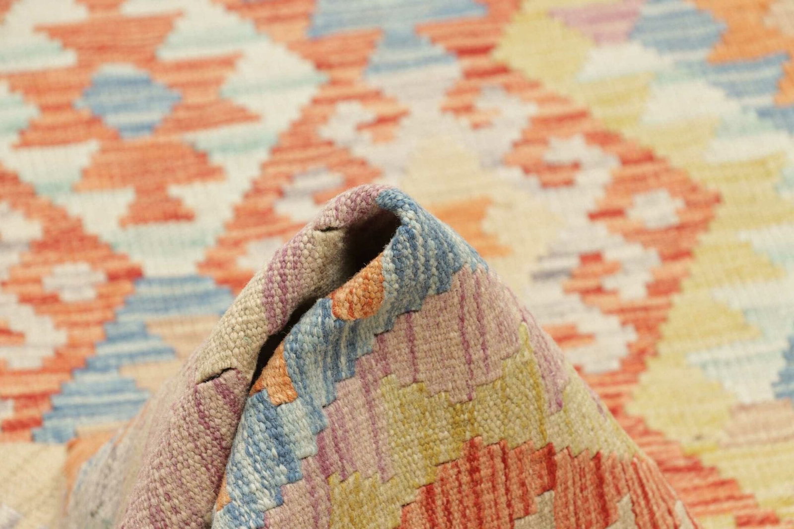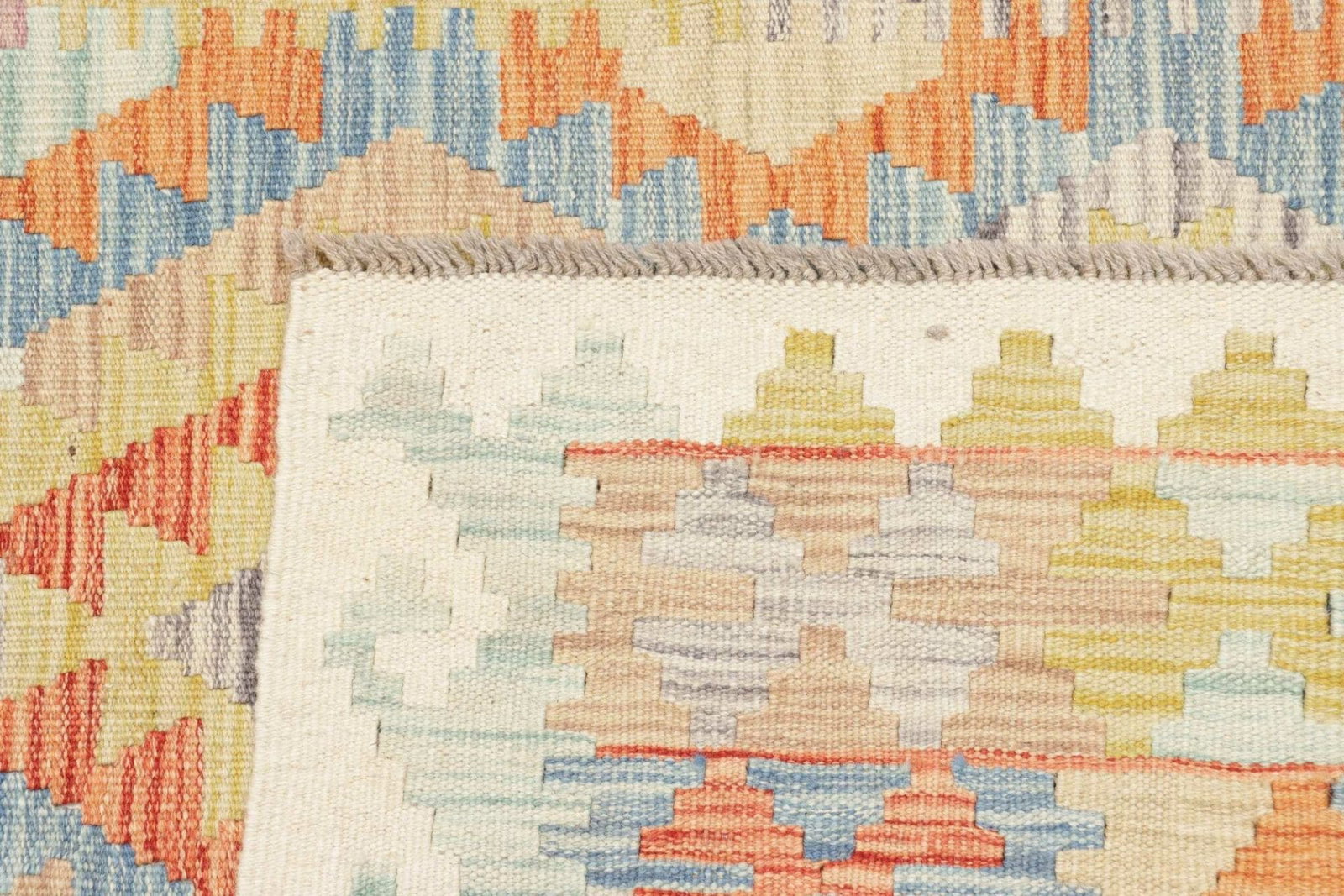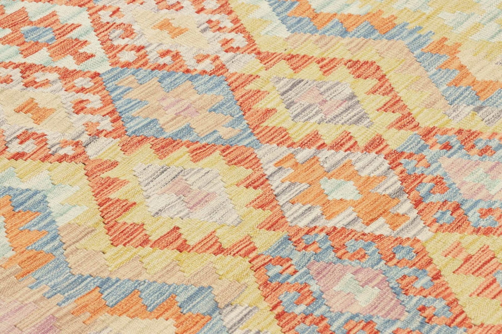 Ein weiterer großer Vorteil dieses handgewebten Kelim Teppichs ist seine Pflegeleichtigkeit. Wolle ist von Natur aus schmutzabweisend und benötigt nur minimale Pflege, um ihre Schönheit zu bewahren. Regelmäßiges Staubsaugen und gelegentliches Ausklopfen reichen aus, um die Struktur und die Farben frisch zu halten. Darüber hinaus sind Kelims durch ihre flache Webart hervorragend für Fußbodenheizungen geeignet.