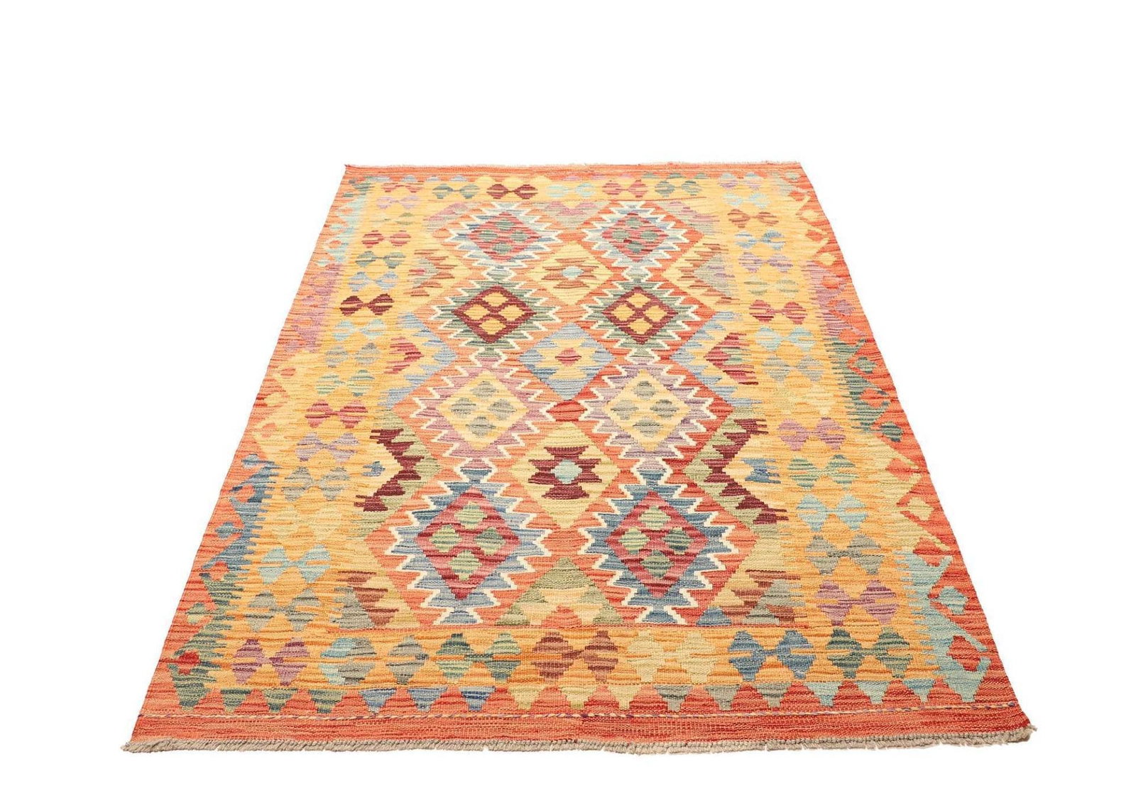 Der Kelim Teppich besteht vollständig aus Schurwolle, einem Material, das für seine Robustheit und Langlebigkeit geschätzt wird. Wolle hat natürliche Eigenschaften, die sie besonders pflegeleicht und schmutzresistent machen. Die handgewebte Technik garantiert, dass jedes Stück ein unverwechselbares Unikat darstellt, wodurch die traditionelle Kunst der Teppichweberei lebendig bleibt. Die Knotendichte ist ein wichtiges Qualitätsmerkmal; bei diesem Teppich ist die Dichte optimal, um sowohl Strapazierfähigkeit als auch Komfort zu gewährleisten.