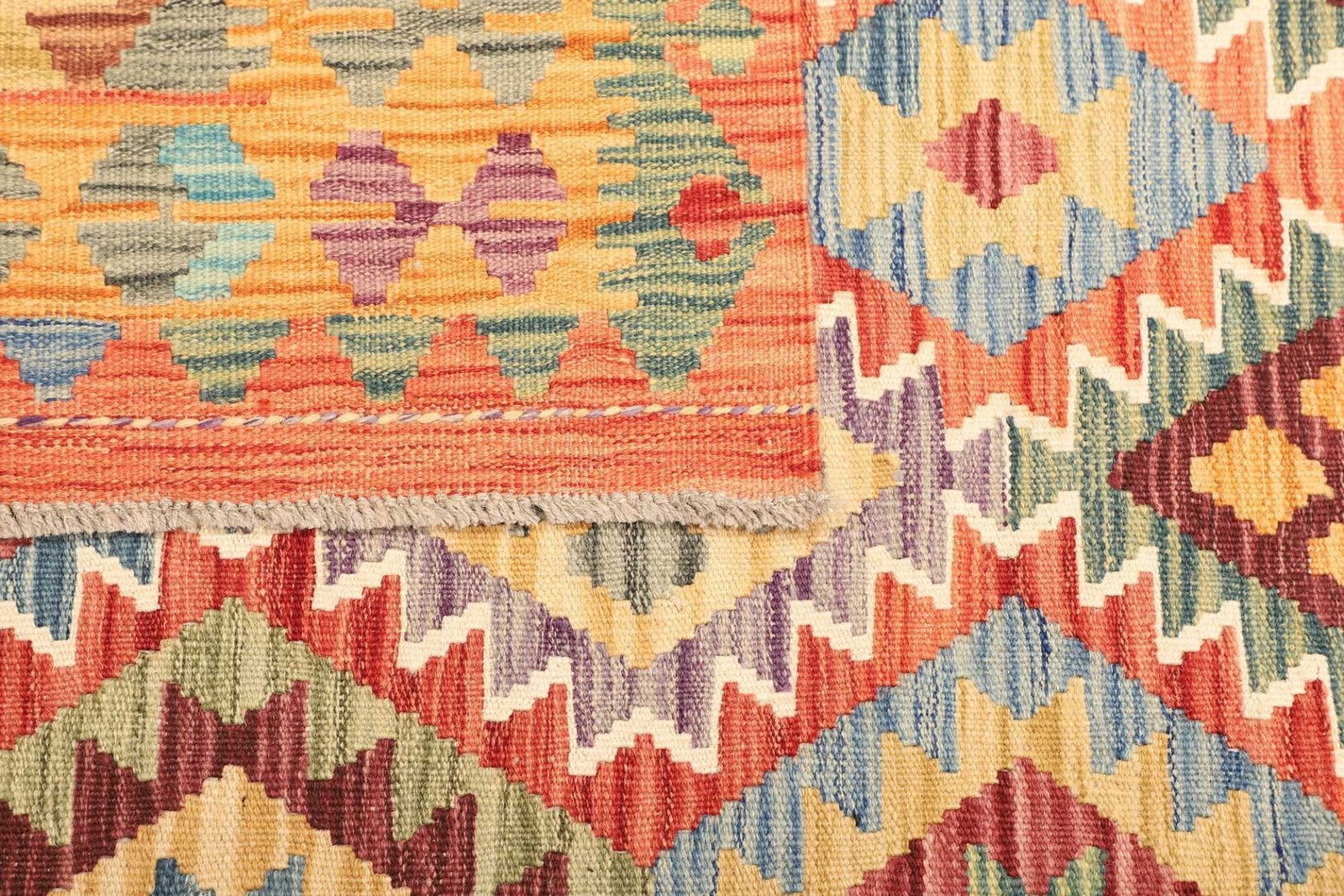 Ein weiterer Vorteil dieses handgewebten Kelim Teppichs ist seine Vielseitigkeit. Er kann sowohl im Wohnzimmer, Schlafzimmer als auch in Fluren eingesetzt werden. Die natürliche Wolle sorgt für eine angenehme Haptik, und die robuste Verarbeitung garantiert eine lange Lebensdauer. Zudem ist der Teppich leicht zu reinigen und pflegen, was ihn zu einer idealen Wahl für Haushalte mit Kindern oder Haustieren macht.
