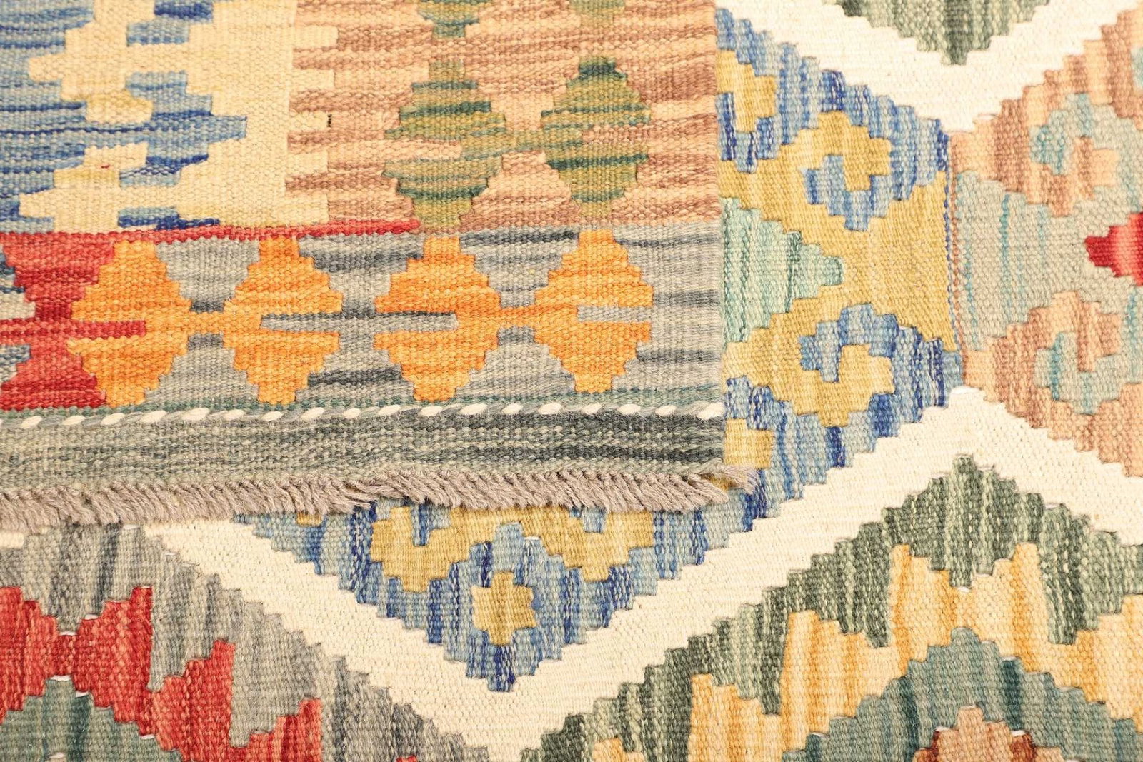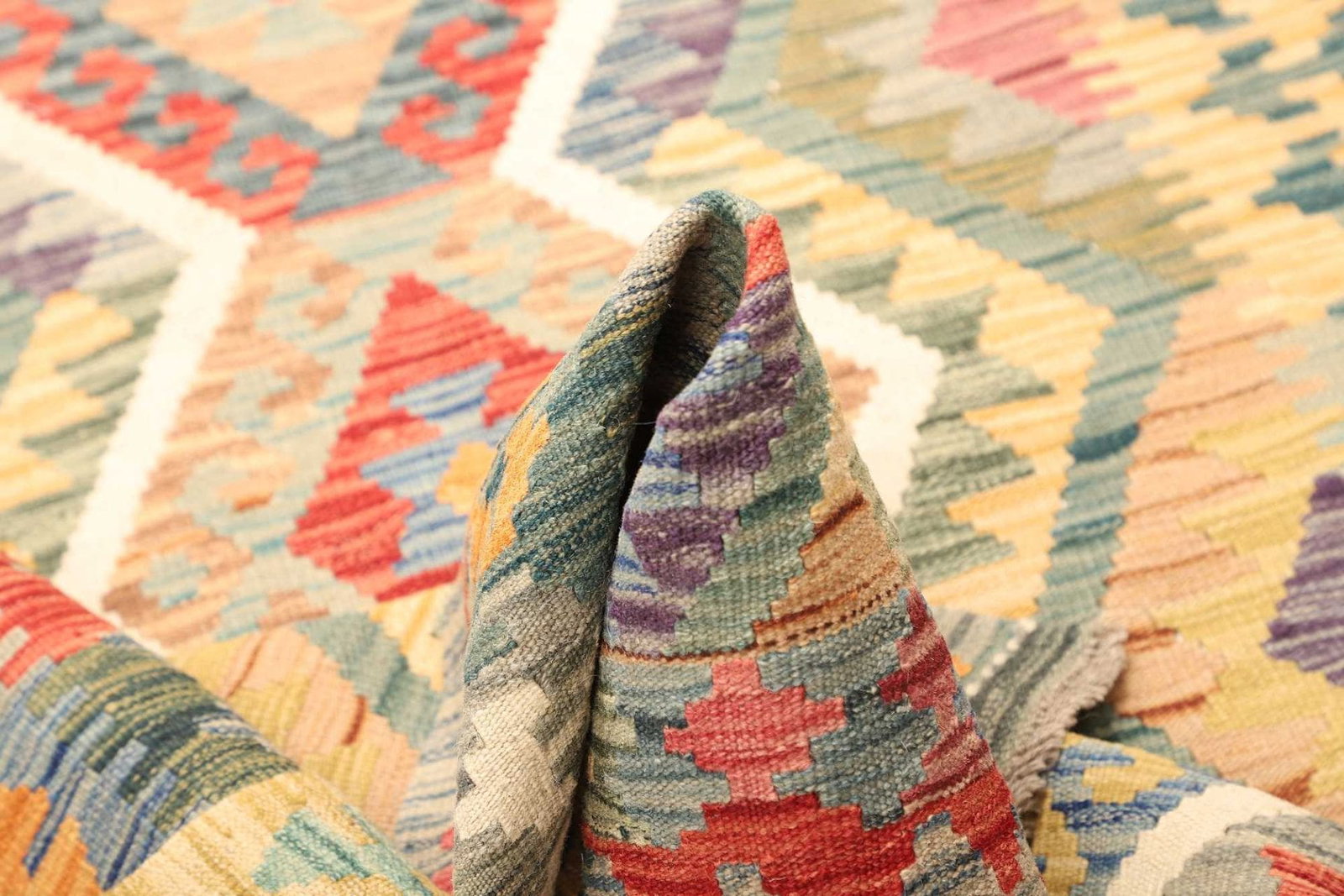 Ein herausragendes Merkmal des handgewebten Kelim Teppichs ist seine Vielseitigkeit. Ob im Wohnbereich, Schlafzimmer oder Flur – dieser Teppich fügt sich harmonisch in jedes Raumkonzept ein. Darüber hinaus wirkt er schalldämpfend und sorgt für ein warmes Ambiente. Seine strapazierfähige Beschaffenheit macht ihn auch ideal für stark frequentierte Bereiche.