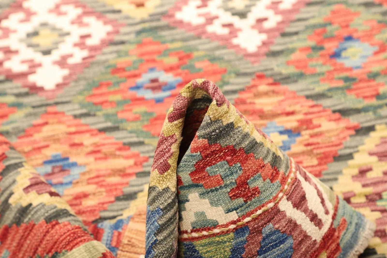Der Kelim Teppich besteht aus hochwertiger Schurwolle, einem Material, das für seine Langlebigkeit und Weichheit bekannt ist. Schurwolle ist eine natürliche Faser, die Feuchtigkeit regulieren kann und gleichzeitig eine hervorragende Isolierung bietet. Diese Eigenschaften machen den Teppich nicht nur angenehm beim Berühren, sondern auch funktional für jeden Raum. Der handgewebte Teppich ist ein Meisterwerk orientalischen Handwerks, das mit viel Sorgfalt und Liebe zum Detail hergestellt wurde. Die traditionelle Technik des Kelim-Weberns sorgt dafür, dass jeder Teppich ein einzigartiges Kunstwerk ist.