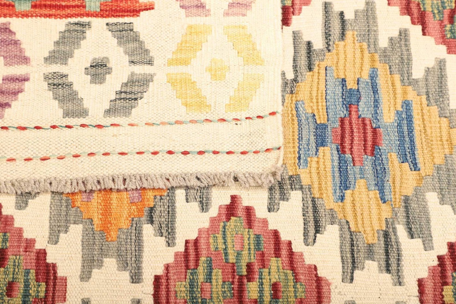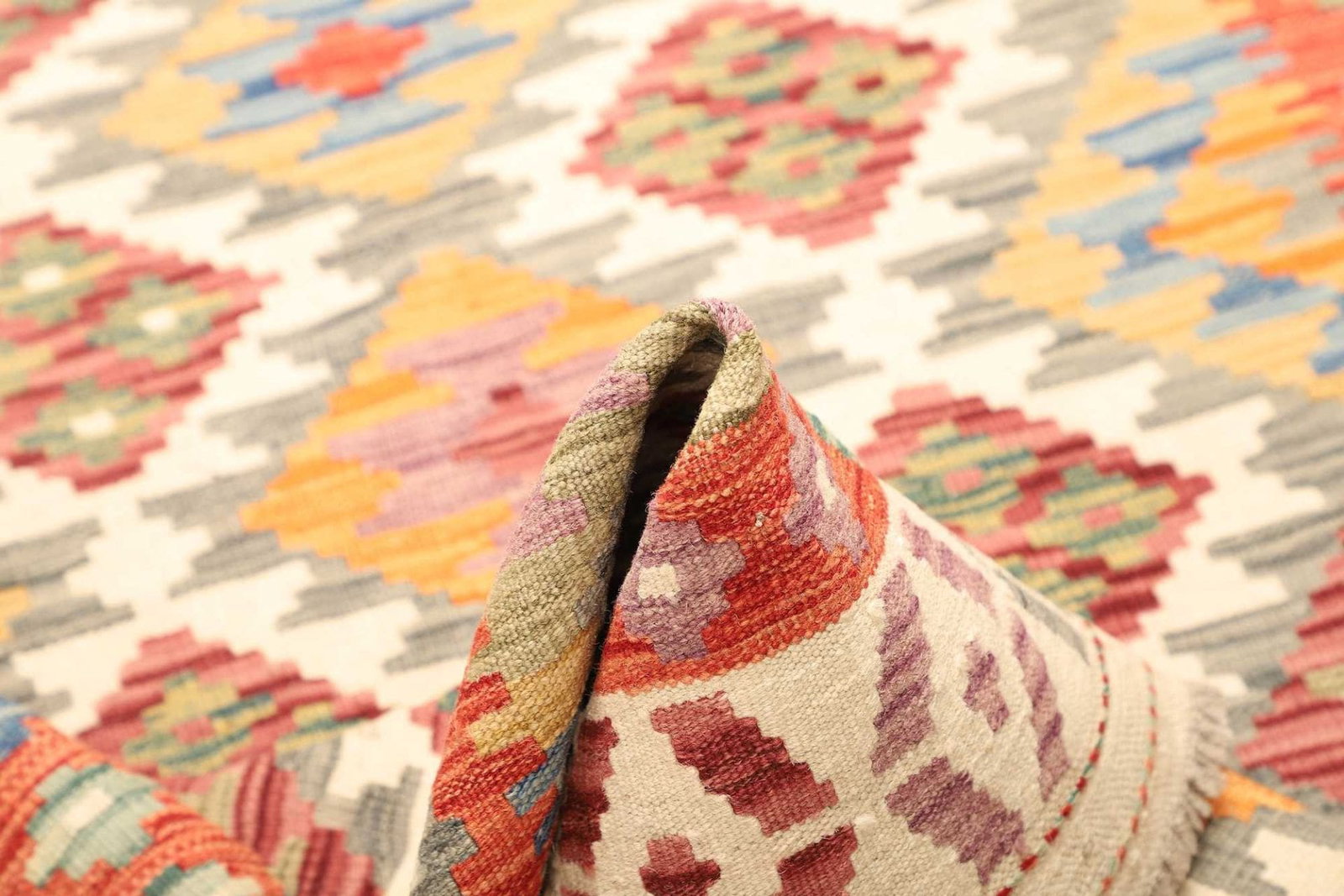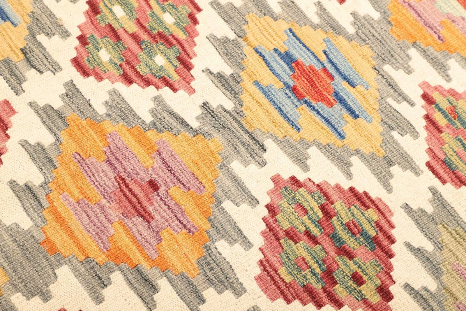 Der Teppich besteht aus feiner Schurwolle, die für ihre Weichheit, Strapazierfähigkeit und Langlebigkeit bekannt ist. Wolle ist ein hervorragendes Material für Teppiche, da sie von Natur aus schmutzabweisend ist und eine hohe Widerstandsfähigkeit gegen Abnutzung und Verfärbung aufweist. Die handgewebte Technik, die für die Herstellung dieses Kelim Teppichs verwendet wird, sorgt dafür, dass jede Fasern perfekt miteinander verwoben sind, was zu einer dichten Struktur und einem schönen, einheitlichen Erscheinungsbild führt.