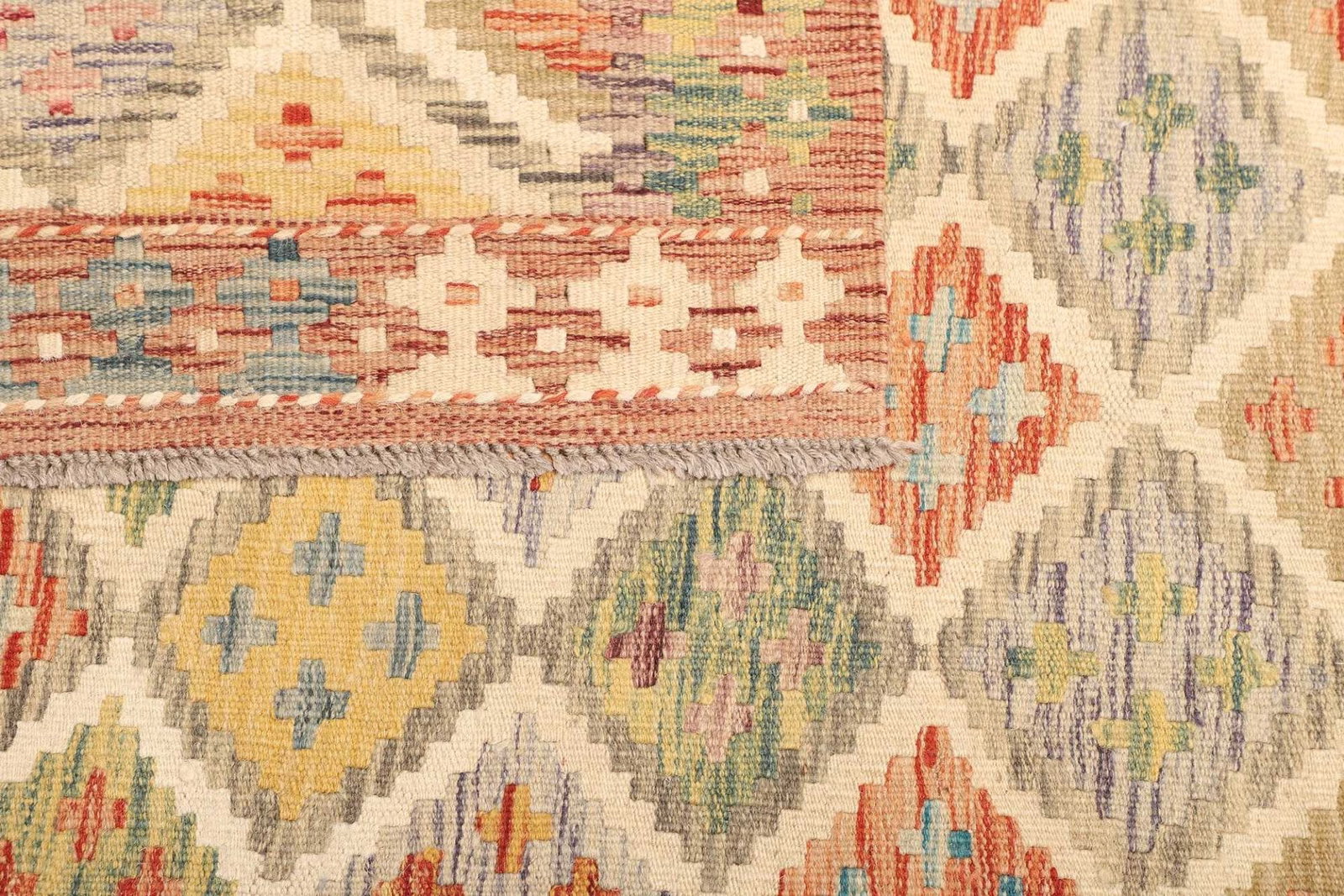 Ein weiterer wichtiger Aspekt dieses handgewebten Kelim Teppichs ist seine Vielseitigkeit. Ob im Wohnzimmer, Flur oder Schlafzimmer, dieser Teppich fügt sich harmonisch in jede Umgebung ein und bringt ein Gefühl von Wärme und Behaglichkeit mit sich. Seine robuste Bauweise sorgt dafür, dass er auch in stark frequentierten Wohnbereichen seine Struktur und Optik long-lasting behält.