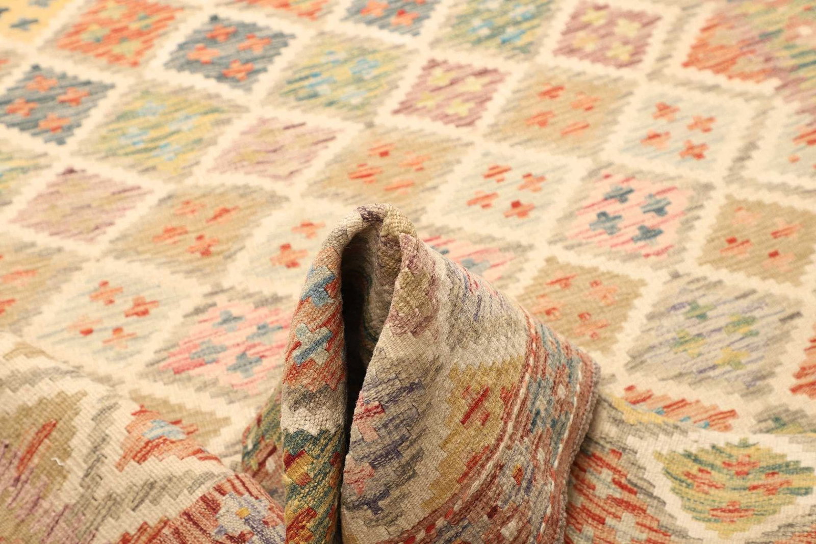Die Verwendung von Schurwolle für diesen Kelim Teppich garantiert nicht nur eine lange Lebensdauer, sondern auch eine angenehme Haptik und natürliche Wärme. Schurwolle ist bekannt für ihre hohe Elastizität und ist von Natur aus schmutz- und fleckenabweisend, was die Pflege erleichtert. Darüber hinaus sorgt die handgewebte Technik für ein einzigartiges und individuelles Design, da jeder Teppich ein Kunstwerk für sich ist. Die Knotendichte dieses Teppichs ist optimal gewählt, um sowohl für Gemütlichkeit zu sorgen als auch die strapazierfähigen Eigenschaften zu betonen.