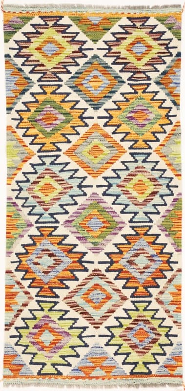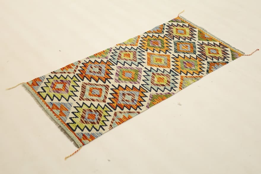 Kelim-Teppich | Handgewebt aus Afghanistan | Farbe: Weiß/Beige | Größe: 141×65 cm | Dicke: ca. 3 mm | Flor: Handgesponnene Wolle | Kette: Wolle | Gewicht: ca. 2 kg | Zustand: Neu