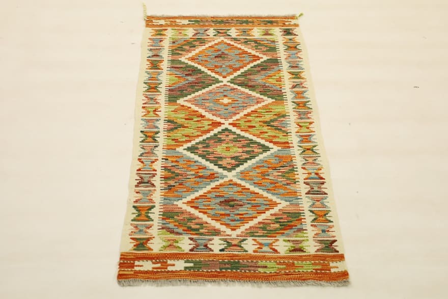 Kelim Teppich | Handgewebt | Ursprung: Afghanistan | Knotendichte: Hoch | Größe: 144×61 cm | Material: Kette aus Wolle, Flor aus handgesponnener Wolle | Farbe: Multifarbe | Form: Läufer | Alter: Neu | Dicke: ca. 3 mm | Gewicht: ca. 2 kg