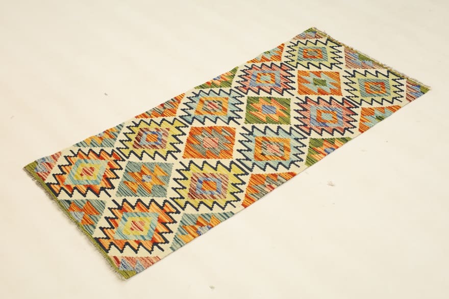 Handgewebter Kelim-Teppich | Ursprung: Afghanistan | Größe: 144×63 cm | Farbe: Weiß/Beige | Verarbeitung: Handgewebt | Flor: Handgesponnene Wolle | Dicke: ca. 3 mm | Gewicht: ca. 2 kg | Zustand: Neu