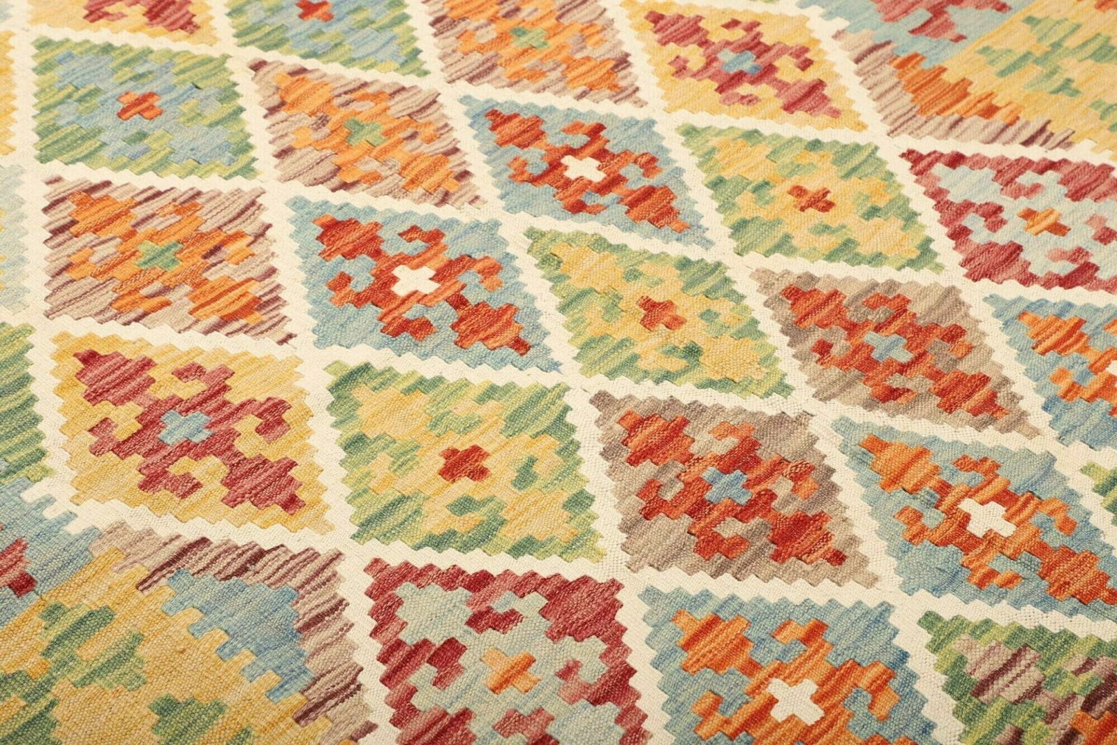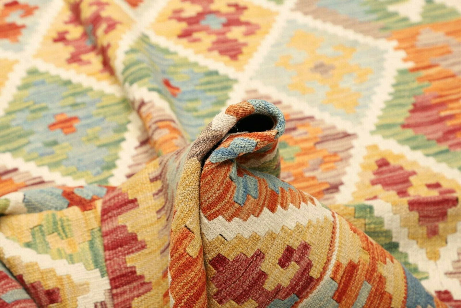 Der Kelim Teppich besteht aus hochwertigen, natürlichen Fasern, die nicht nur für eine lange Lebensdauer sorgen, sondern auch für eine angenehme Haptik. Handgewebt aus Wolle, bietet dieser Teppich einen perfekten Kompromiss zwischen Komfort und Beständigkeit. Die Verwendung von Wolle sorgt dafür, dass der Teppich atmungsaktiv ist, während die rustikalen Farben und Muster zur gemütlichen Atmosphäre beitragen. Zudem ist Wolle von Natur aus schmutzabweisend, was die Pflege des Teppichs erleichtert.