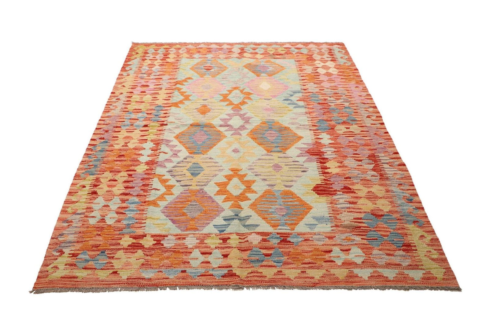 971$ In den WarenkorbKlassischer Orientteppich Kelim Hellblau 240×180 cm – Geometrisches Muster mit Medallion und roter Bordüre, Kurzflor, handgewebt