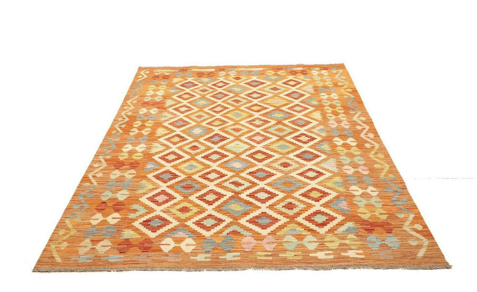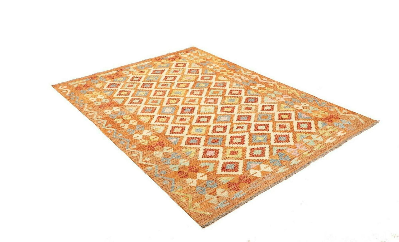 Kelim Teppich | Knotendichte: 200.000 Knoten/m² | Material: 100% Schurwolle im Flor, 100% Baumwolle in der Kette | Größe: 151×199 cm | Herkunft: Pakistan | Zustand: Handgewebte Qualität | Rustikales Flair, ideal für moderne Wohnräume