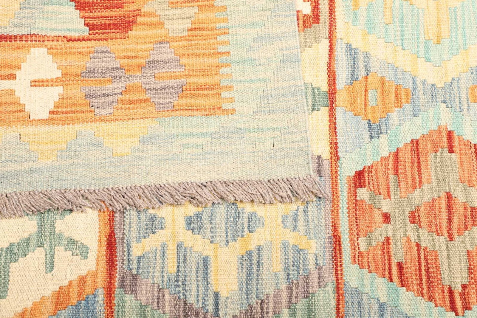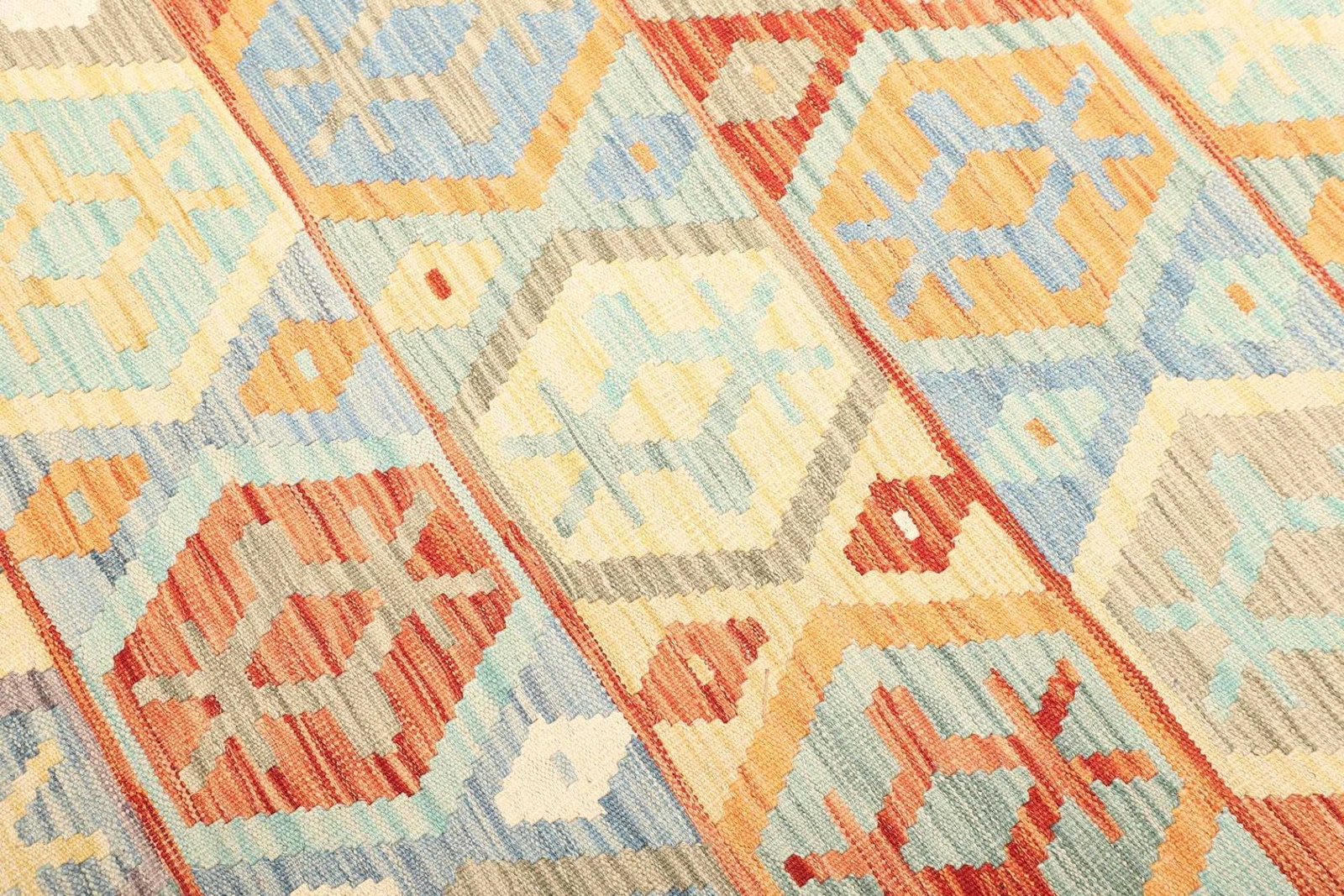 Die Muster und Designs von Kelim Teppichen sind vielfältig und reichen von traditionellen geometrischen Formen bis hin zu stilisierten floralen Motiven. Der hier präsentierte Teppich ist eine Hommage an die afghanische Kultur und zeigt harmonische Farben sowie ausgewogene Kompositionen. Die Verwendung lebendiger Farben, die oft aus natürlichen Farbstoffen gewonnen werden, sorgt für ein lebendiges und gleichzeitig harmonisches Gesamtbild. Diese Designs sind nicht nur optisch ansprechend, sondern haben oft auch eine tiefere symbolische Bedeutung. Zentren und Ränder sind häufig mit traditionellen Motiven verziert, die Glück, Wohlstand und Schutz symbolisieren.