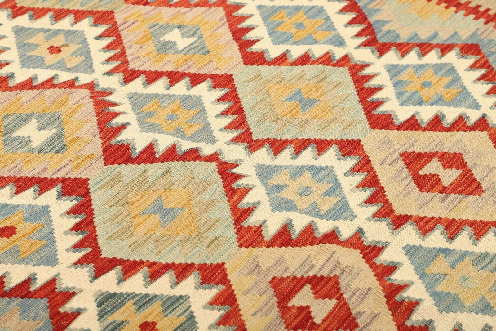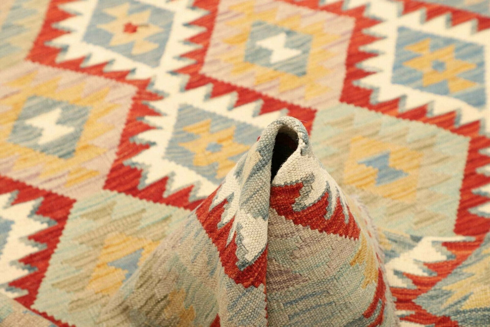 Farblich wird der Kelim Teppich durch warme Erdtöne ergänzt, oft gepaart mit lebendigen Akzenten, die ihn zu einem Blickfang machen.