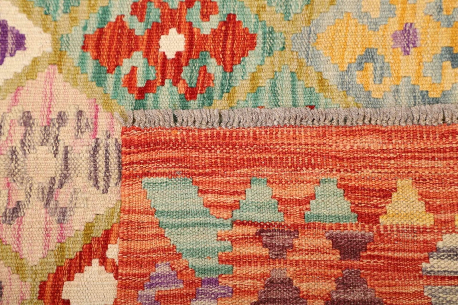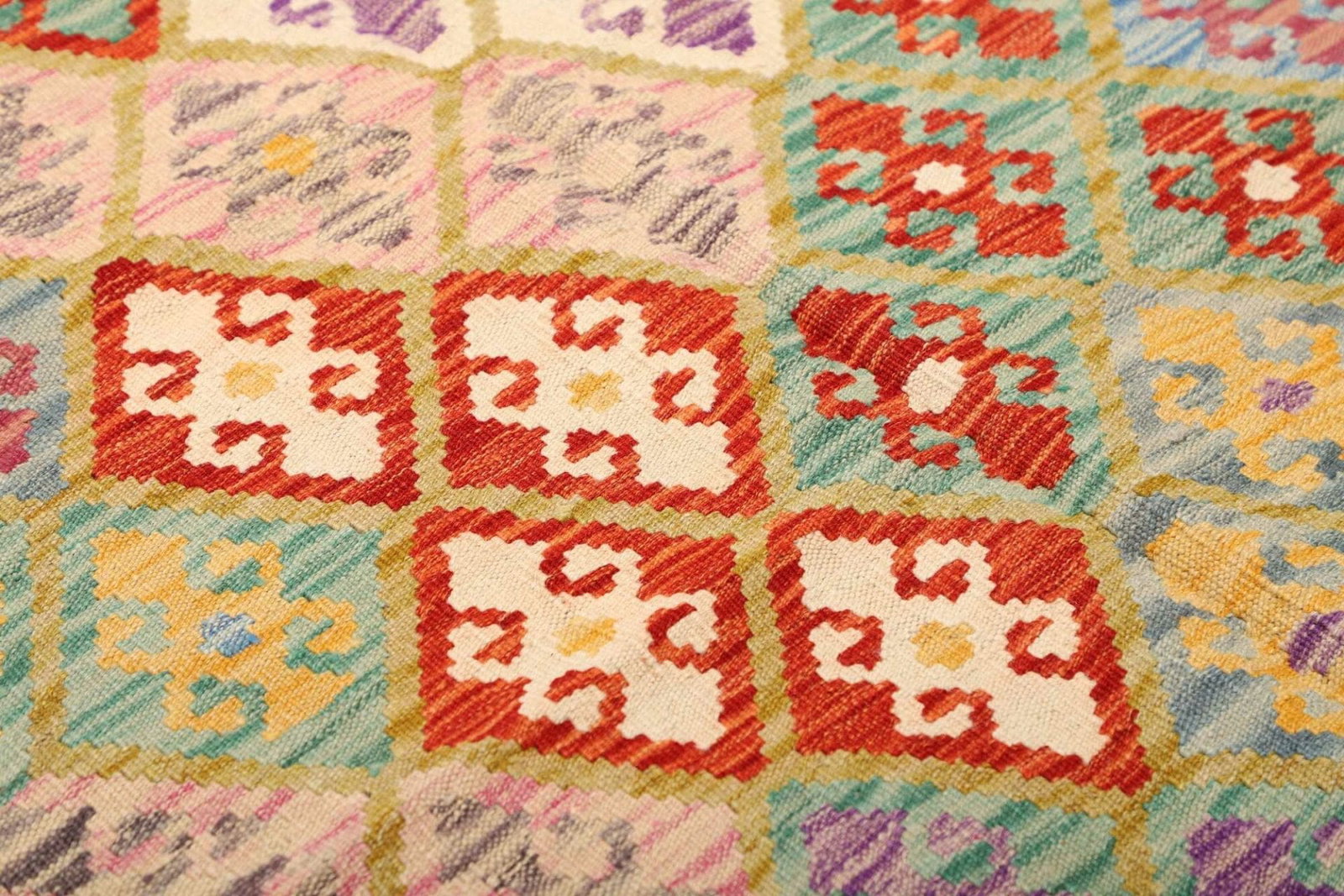 Ein weiterer Vorteil des Kelim Teppichs ist die Pflegeleichtigkeit. Durch die strapazierfähige Wolle ist der Teppich widerstandsfähig gegenüber Schmutz und Flecken, was ihn ideal für den täglichen Gebrauch macht. Zudem sorgt die handgewebte Struktur dafür, dass der Teppich auch in stark frequentierten Bereichen gut aussieht und bestehen bleibt.