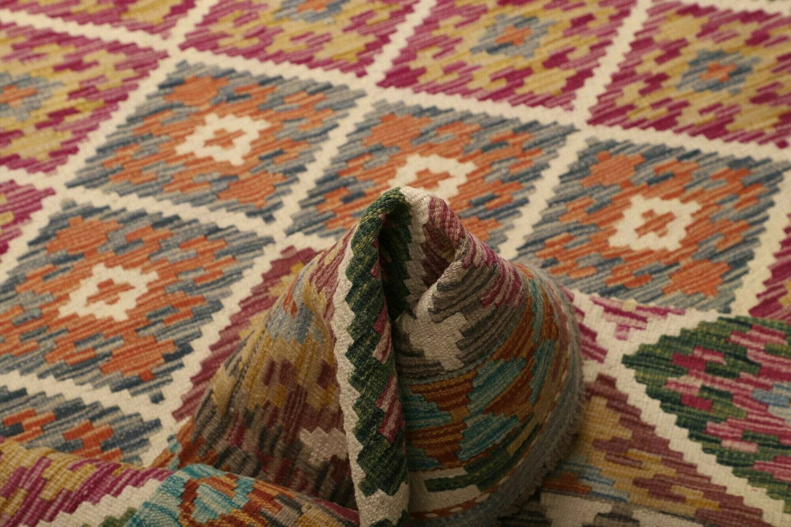 Zusätzlich bietet der handgewebte Kelim Teppich ausgezeichnete Isolationseigenschaften, was ihn sowohl für warme als auch für kühle Klimazonen ideal macht. Durch die Verwendung natürlicher Wolle wird zudem eine klimaausgleichende Wirkung erreicht, die das Raumklima positiv beeinflussen kann.