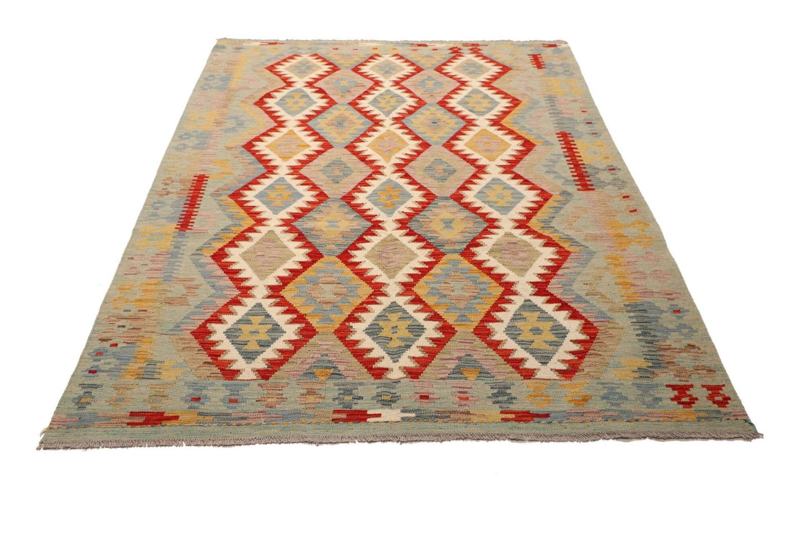 Kelim Teppich | Knotendichte: ca. 200.000 Knoten/m² | Florhöhe: ca. 5 mm | Material: 100% Schurwolle | Kette: 100% Baumwolle | Größe: 153 x 201 cm | Handgewebte Qualität | Herkunft: Pakistan | Vielseitig einsetzbar als Teppich, Vorhang oder Wandschmuck