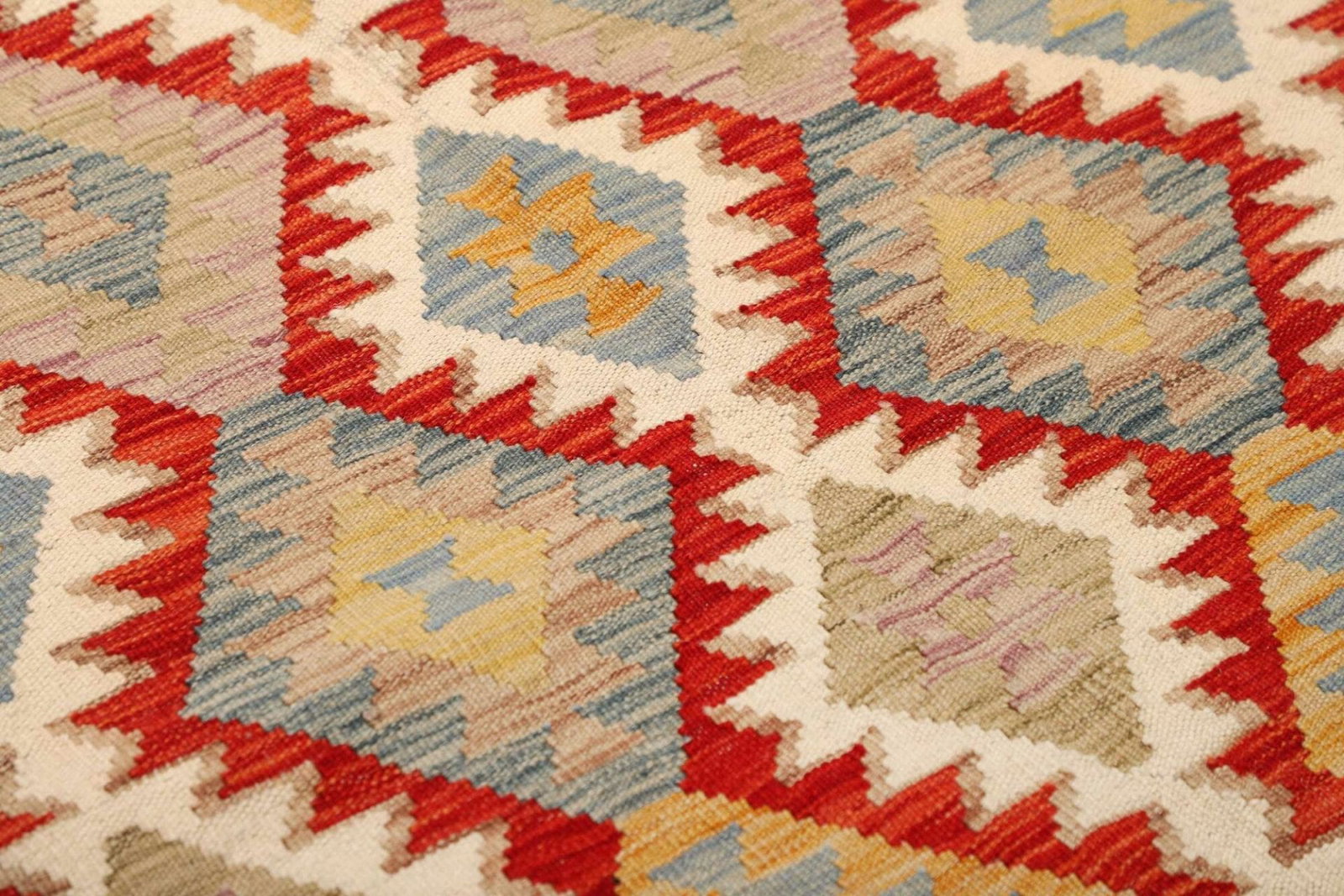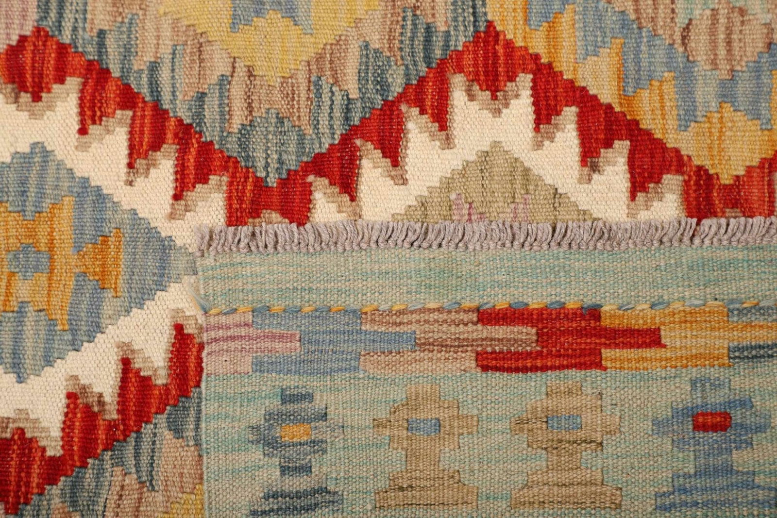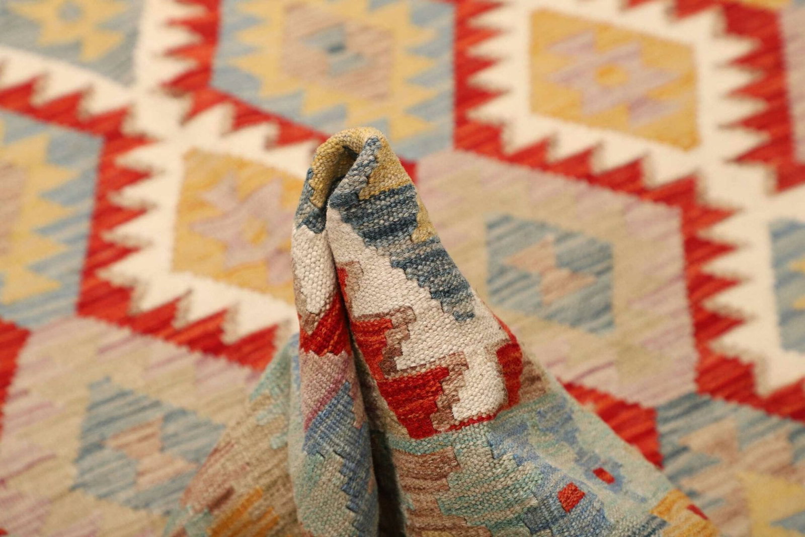 Ein weiterer Vorteil dieses handgewebten Kelim Teppichs ist seine Pflegeleichtigkeit und Langlebigkeit. Aufgrund der Eigenschaften der Schurwolle ist der Teppich schmutzabweisend und kann einfach mit einem Staubsauger gereinigt werden. Übermäßige Feuchtigkeit sollte jedoch vermieden werden, um die Struktur der Wolle zu erhalten.