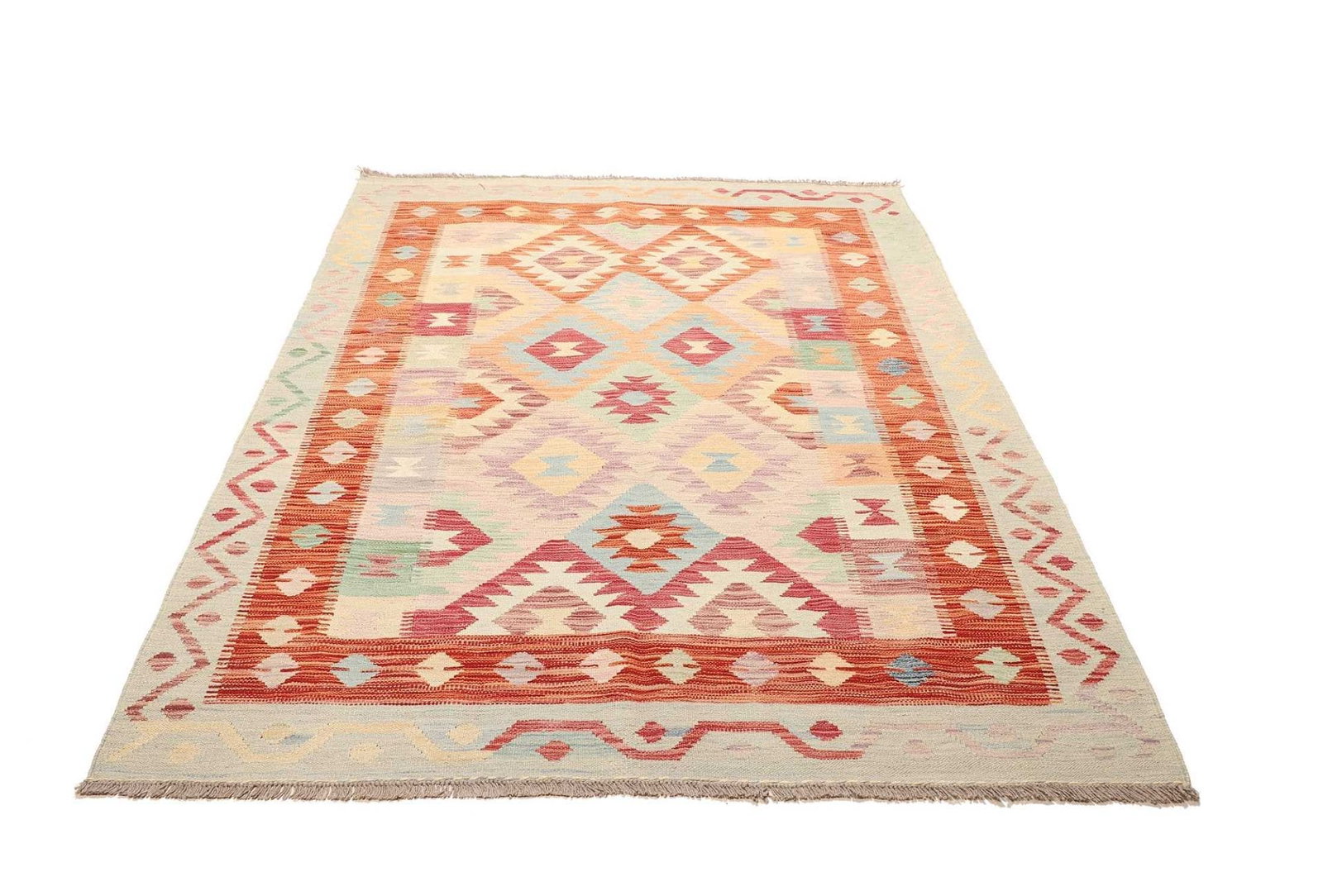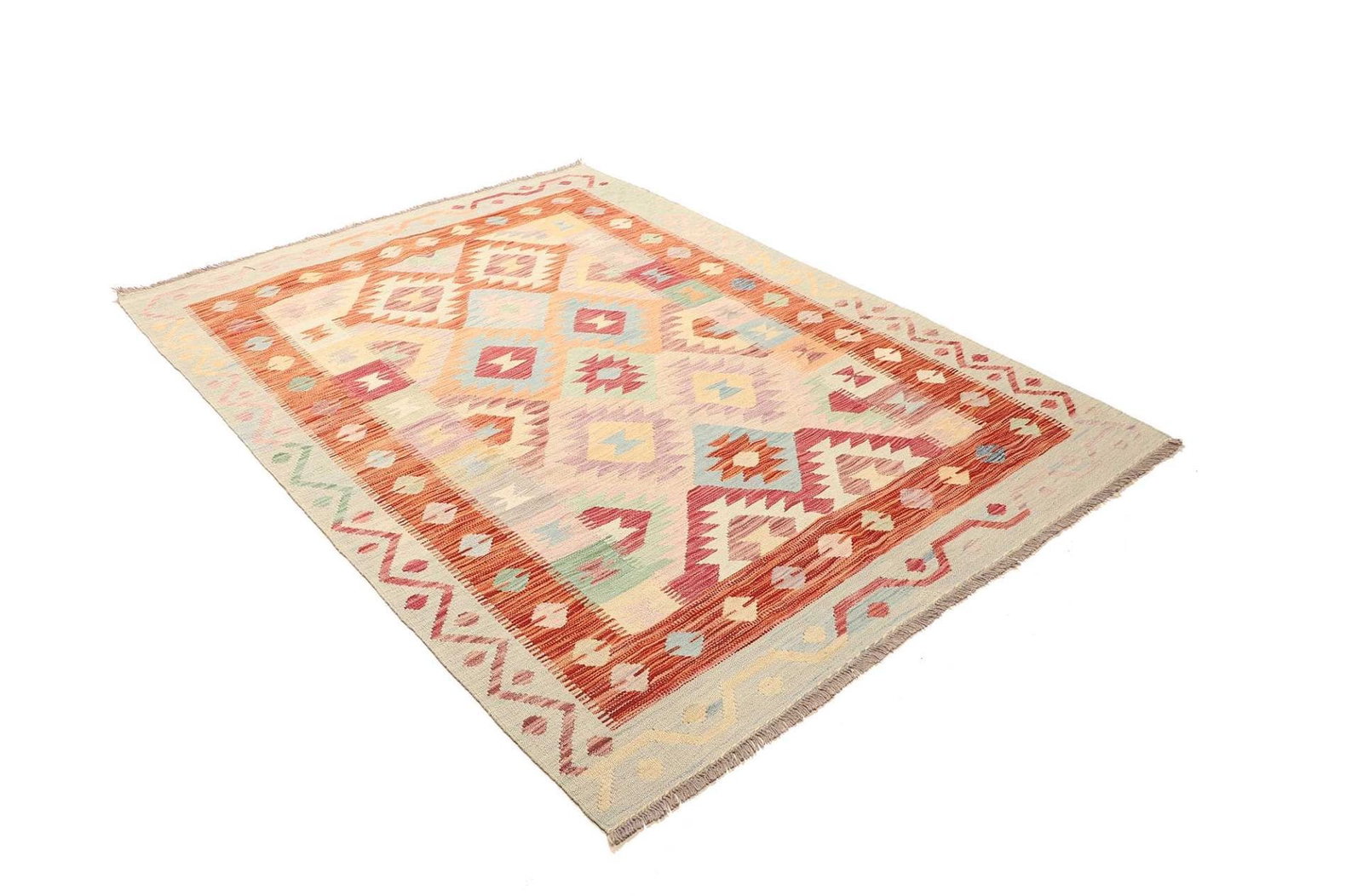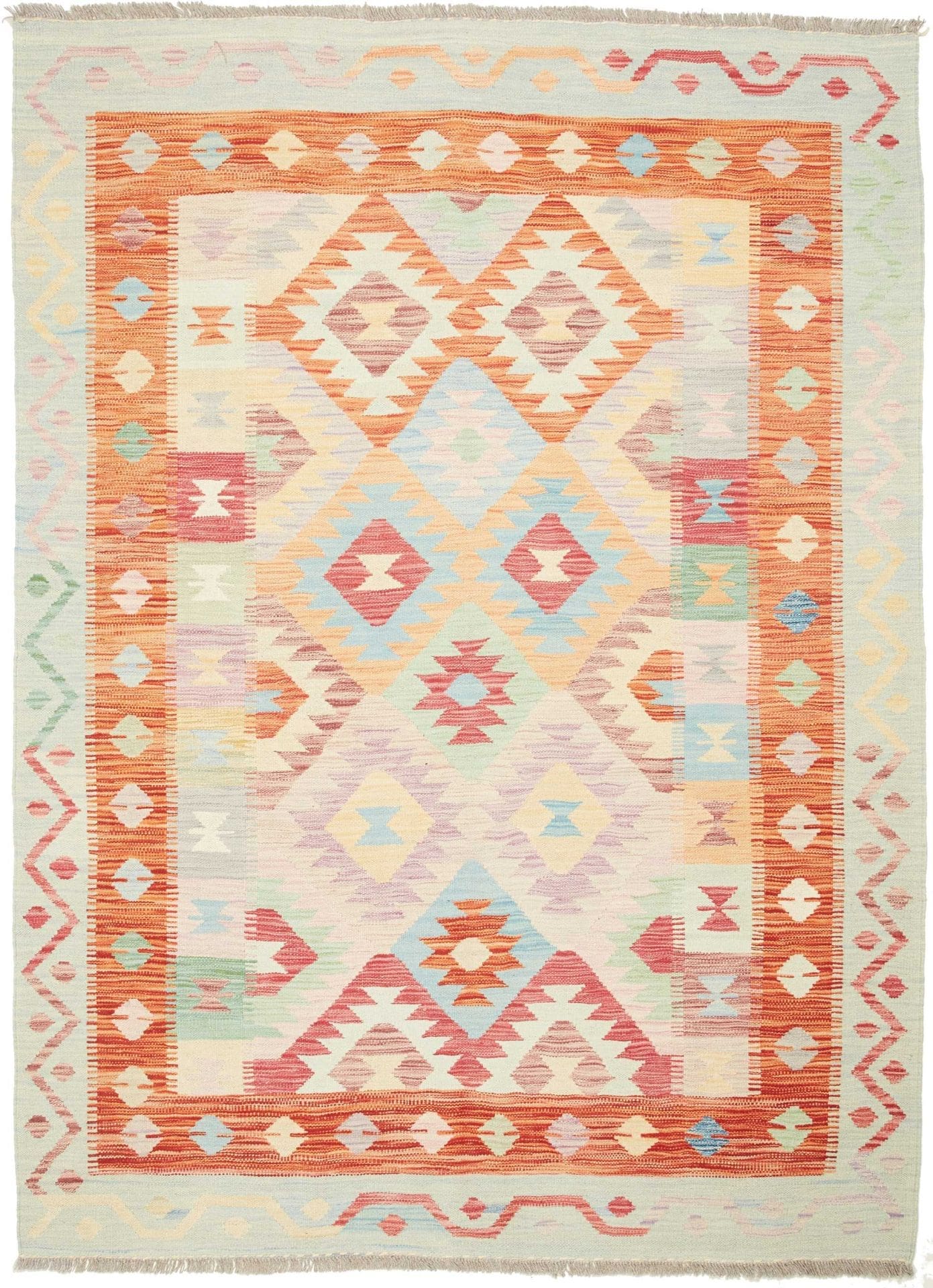624$Ursprünglicher Preis war: 624$439$Aktueller Preis ist: 439$Kelim Teppich | Knotendichte: ca. 200.000 Knoten/m² | Material: 100% Schurwolle | Größe: 153 x 204 cm | Herkunft: Pakistan | Zustand: Handgewebt | Florhöhe: ca. 5 mm | Kette: 100% Baumwolle