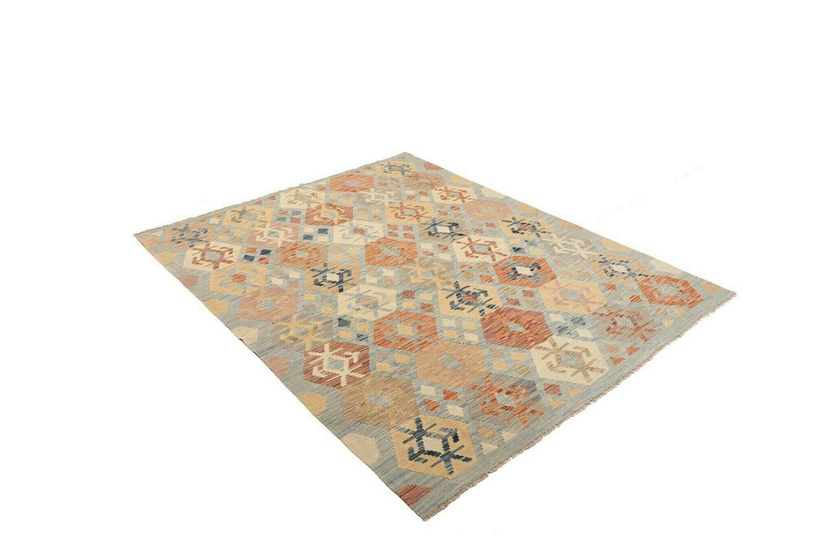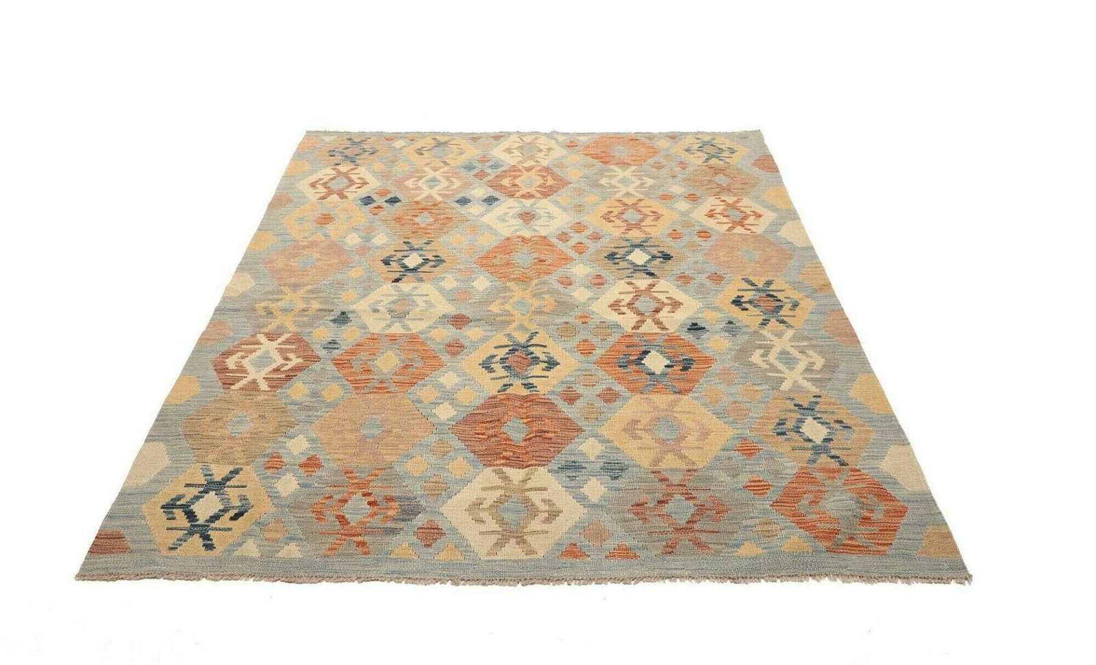 Handgewebter Kelim Teppich | Herkunft: Pakistan | Knotendichte: ca. 200.000 Knoten/m² | Flor: 100% Schurwolle | Kette: 100% Baumwolle | Größe: 154 x 190 cm | Höhe: ca. 5 mm | Rustikales Flair, ideal für moderne Einrichtung
