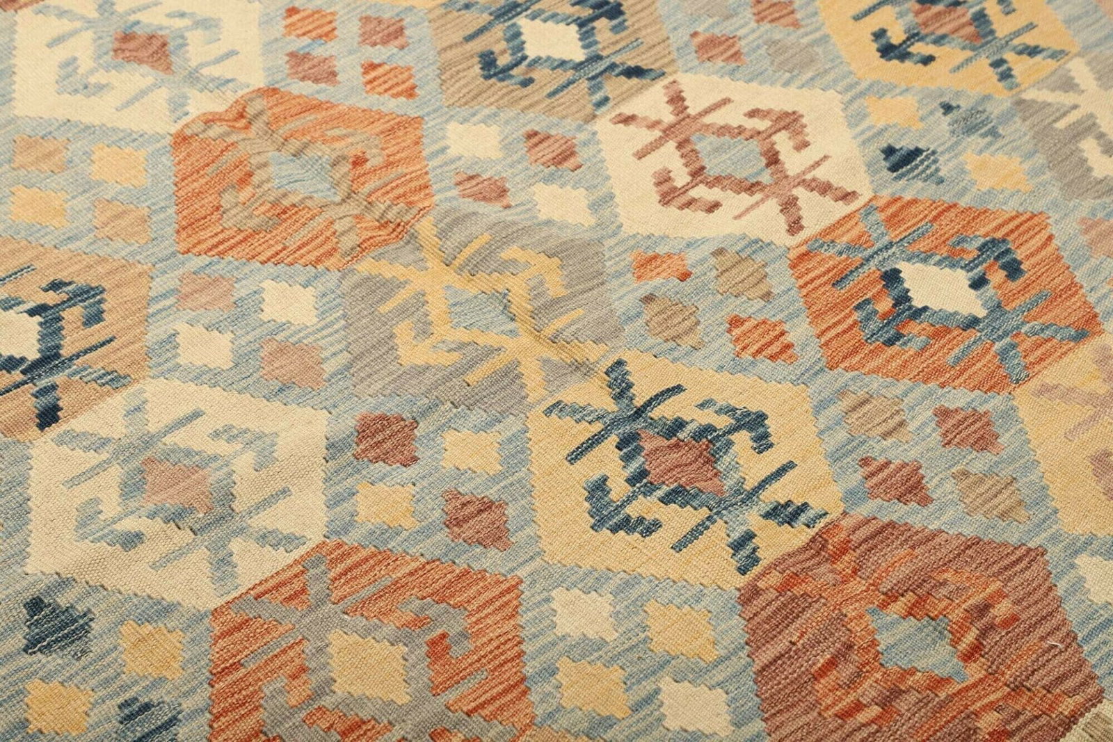 Die Gestaltung des Kelim Teppichs zeichnet sich durch geometrische Muster und lebendige Farben aus, die eine harmonische und gleichzeitig dynamische Ausstrahlung erzeugen. Die Muster können symbolischen Charakter haben und stehen oft in Verbindung mit der Kultur und den Traditionen des jeweiligen Herstellungsgebiets.