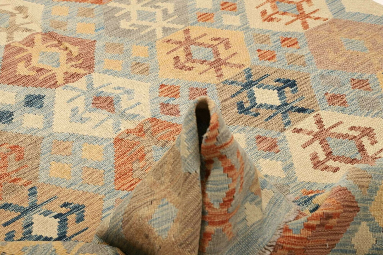 Zudem ist der Kelim Teppich sehr pflegeleicht; fleckenabweisende Eigenschaften der Materialien erleichtern die Reinigung und ermöglichen eine langlebige Freude an diesem Kunstwerk.