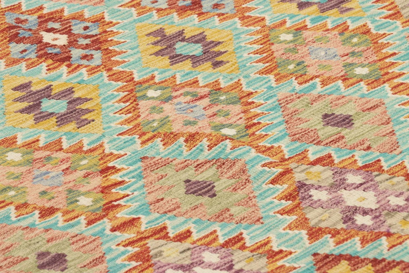 Ein hervorstechendes Merkmal unseres handgewebten Kelim Teppichs ist die hohe Knotendichte, die für zusätzliche Strapazierfähigkeit sorgt. Das rustikale Design schafft nicht nur eine gemütliche Atmosphäre, sondern symbolisiert auch die natürlichen Elemente und Traditionen des Ortes seines Ursprungs. Die sanften Farben und die unregelmäßigen Muster harmonieren perfekt miteinander und sorgen für eine einladende Stimmung in jedem Raum.