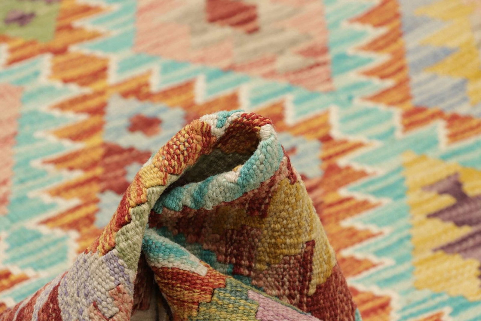 Unser Kelim Teppich zeichnet sich durch die Verwendung von erstklassigen, natürlichen Materialien aus. Traditionell werden bei der Herstellung often Schurwolle und Baumwolle verwendet, die für ihre Strapazierfähigkeit und ihren Komfort bekannt sind. Durch die Verwendung dieser Materialien erhält der Teppich nicht nur seine Langlebigkeit, sondern auch eine weiche Textur, die sowohl barfuß als auch in Verbindung mit Schuhen angenehm ist. Die handgewebte Technik garantiert zudem, dass jeder Teppich ein Unikat ist, das die sorgfältige Leidenschaft eines Kunsthandwerkers widerspiegelt.