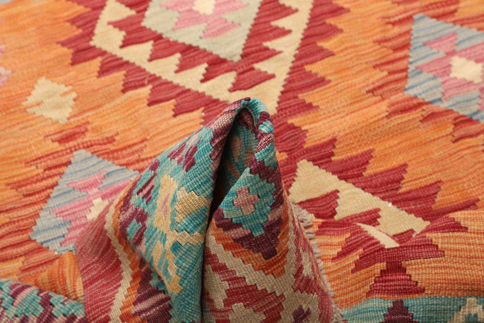 Der Teppich ist aus hochwertiger Wolle gefertigt, einem Material, das für seine Robustheit und seinen natürlichen Glanz bekannt ist. Wolle hat die angenehme Eigenschaft, sowohl isolierend als auch atmungsaktiv zu sein, was bedeutet, dass der Teppich in beiden Jahreszeiten eine behagliche Wohlfühlatmosphäre schafft. Die Handwebtechnik gibt dem Kelim seine charakteristische Flachgewebeoberfläche, die sich angenehm anfühlt und eine lange Lebensdauer garantiert. Zudem ist Wolle von Natur aus schmutzabweisend und pflegeleicht, was die Instandhaltung des Teppichs erleichtert und seine Schönheit langfristig bewahrt.