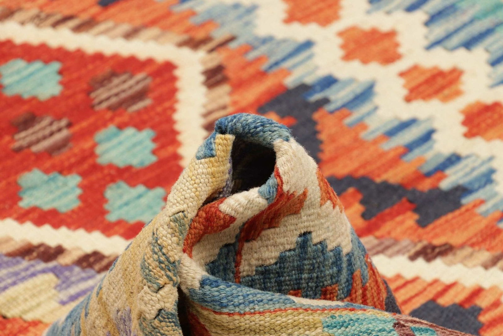 Der Kelim Teppich ist aus 100% reiner Wolle gefertigt. Diese natürliche Faser zeichnet sich durch ihre Atmungsaktivität und Robustheit aus. Wolle ist ein hervorragender Isolator und sorgt für ein angenehmes Raumklima, während sie gleichzeitig Schmutz und Feuchtigkeit abweist. Der Teppich wurde in einer sorgfältigen handgewebten Technik erstellt, die sowohl Zeit als auch Hingabe erfordert. Diese traditionelle Methode garantiert nicht nur eine hohe Qualität, sondern macht jeden Teppich zu einem einzigartigen Kunstwerk.