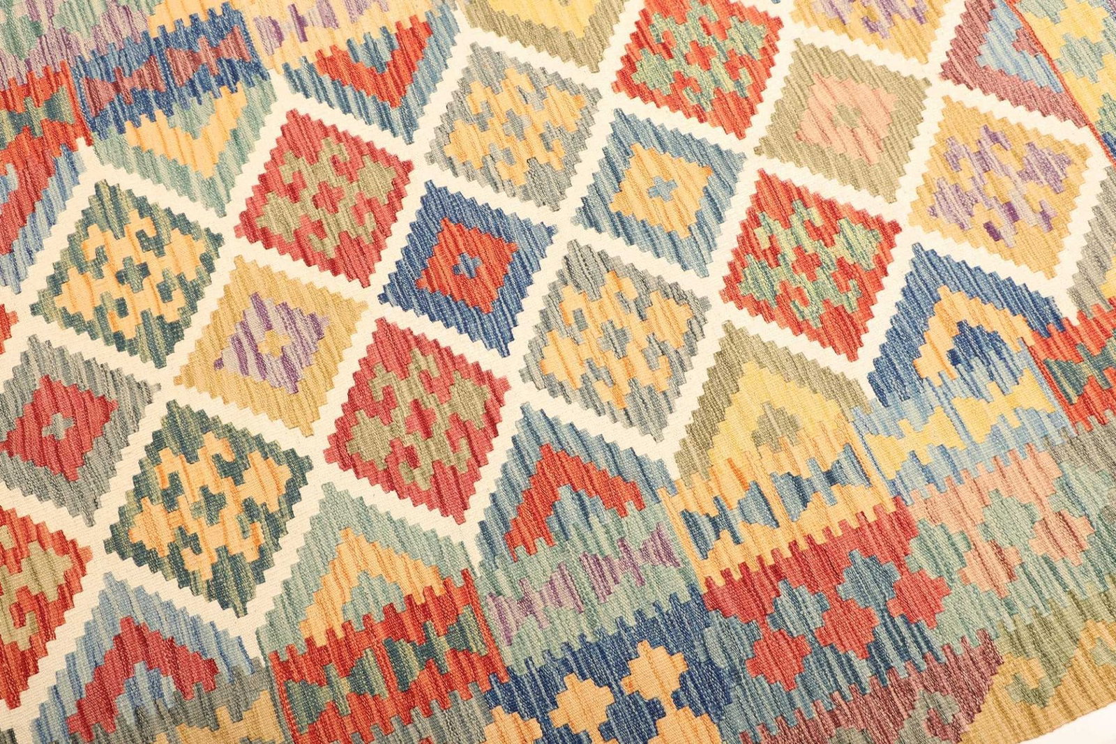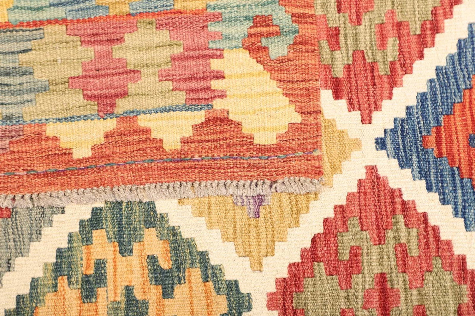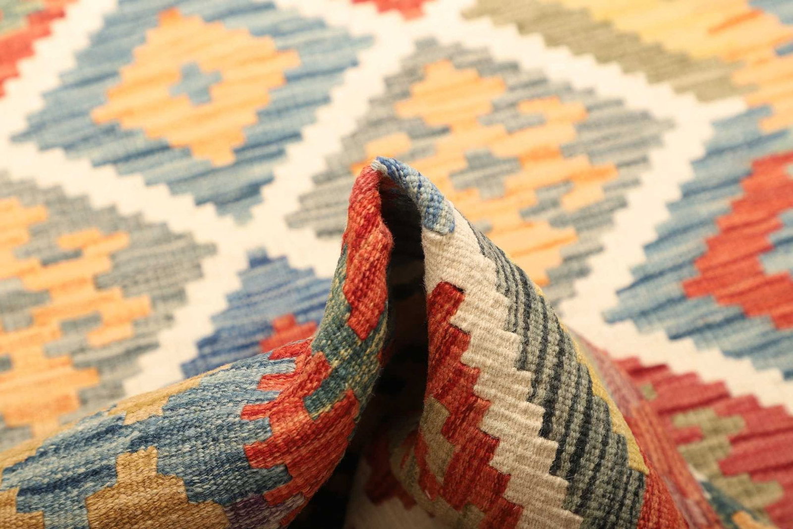 Der Kelim Teppich ist aus reiner Schurwolle gefertigt, einem Material, das für seine Strapazierfähigkeit und seinen natürlichen Glanz bekannt ist. Schurwolle besitzt zudem hervorragende isolierende Eigenschaften und hält sowohl im Winter warm als auch im Sommer kühl. Die handgewebte Technik sorgt dafür, dass jeder Teppich ein Unikat ist. Dabei werden die Wolle und die Farben in traditioneller Weise verarbeitet, was diesem Teppich seinen besonderen Charakter verleiht. Die Knotendichte ist deutlich spürbar und trägt zur Langlebigkeit und Robustheit des Teppichs bei.