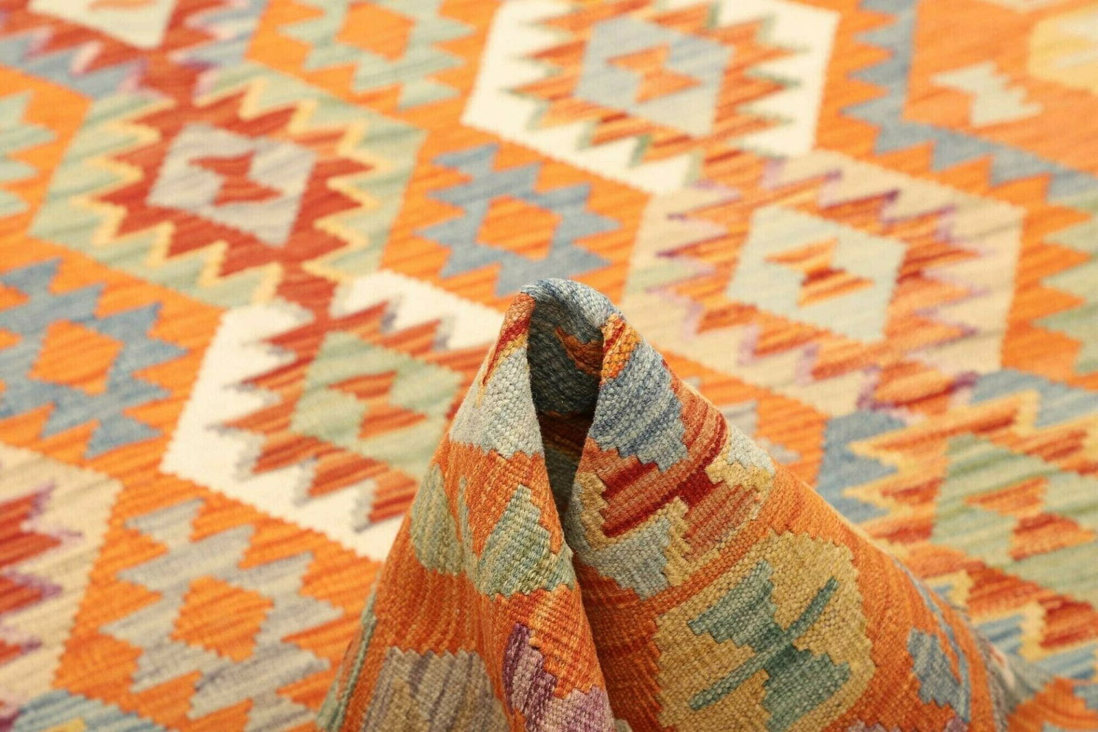 Die handgewebte Technik der Kelims ist besonders bemerkenswert, da sie weitestgehend ohne Verwendung von Knoten auskommt, was den Teppich leicht und flach macht. Diese Bauweise macht ihn ideal für den Einsatz in stark frequentierten Räumen und sorgt für eine angenehme, rutschfeste Oberfläche.