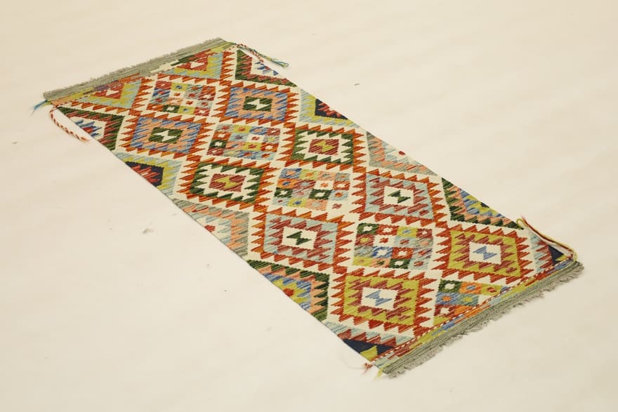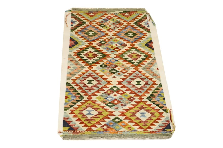 Handgewebter Kelim Teppich | Knotendichte: Hoch | Material: Handgesponnene Wolle | Größe: 155×65 cm | Farbe: Weiß/Beige | Zustand: Neu | Ursprung: Afghanistan | Dicke: ca. 3 mm | Gewicht: ca. 2 kg