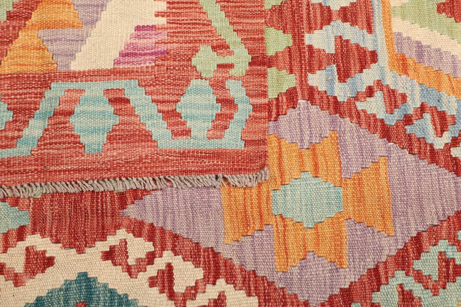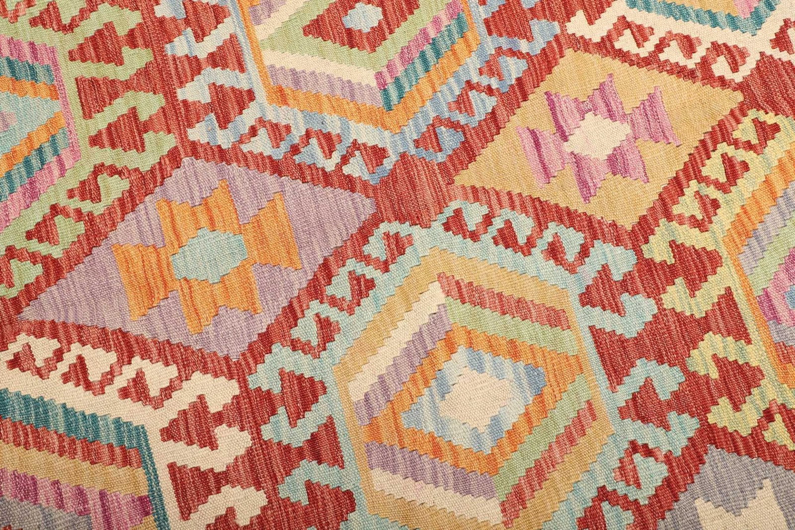 Die Verwendung ausdrucksstarker geometrischer Formen in den Designs ist ein charakteristisches Merkmal des Kelim Stils und verbindet traditionelle Symbolik mit modernem Geschmack. Dies macht den Teppich zu einem vielseitigen Stück, das in jedem Raum zum Blickfang wird.
