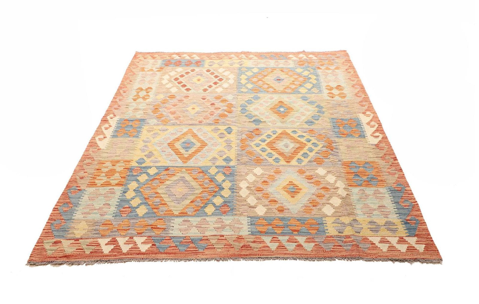 519$Ursprünglicher Preis war: 519$450$Aktueller Preis ist: 450$Kelim Teppich | Knotendichte: ca. 200.000 Knoten/m² | Material: 100% Schurwolle (Flor), 100% Baumwolle (Kette) | Größe: 156 x 195 cm | Herkunft: Pakistan | Höhe: ca. 5 mm | Handgewebte Qualität