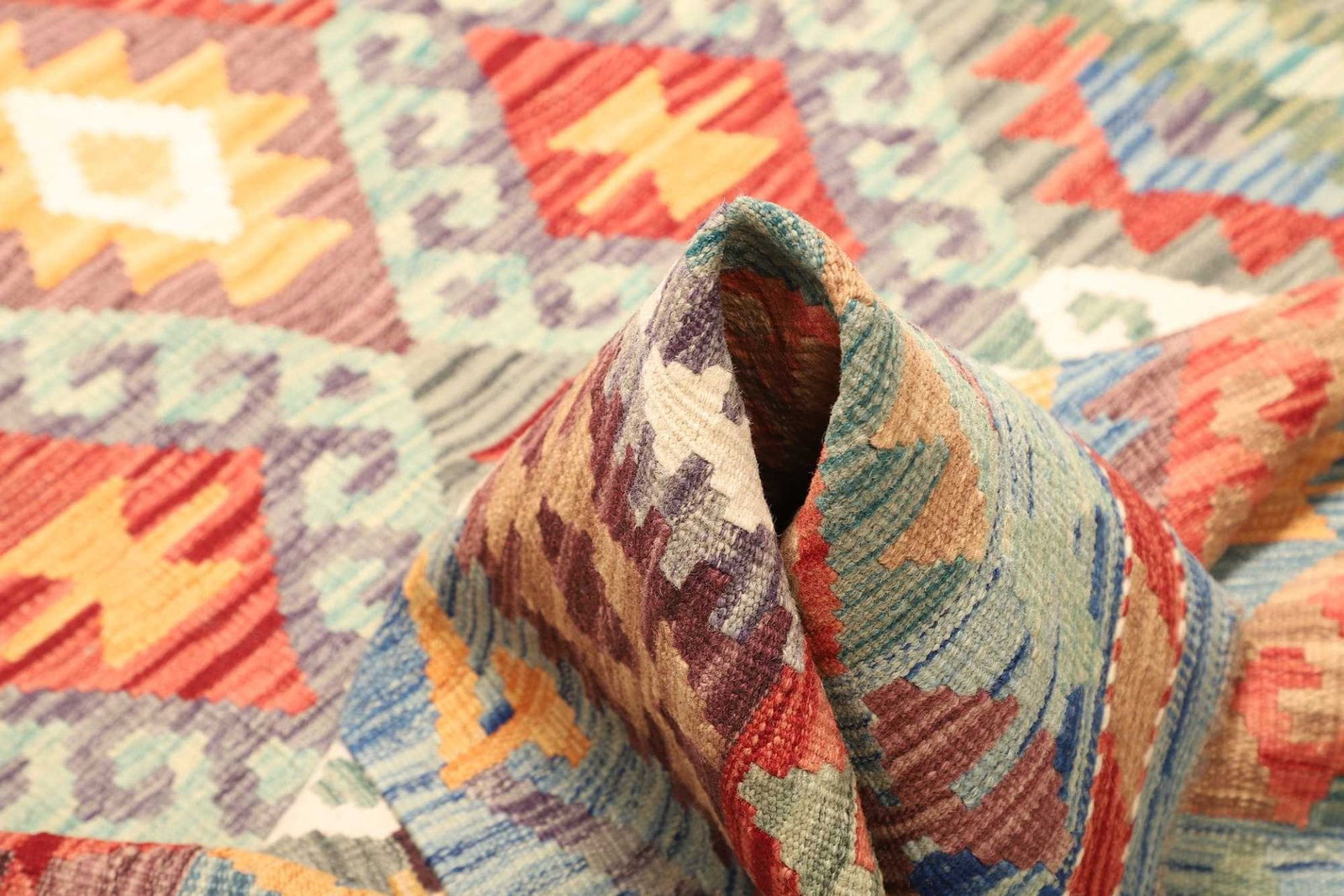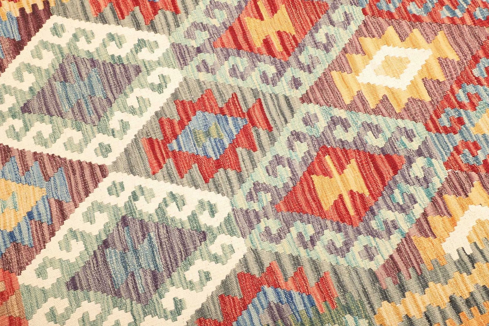 Die handgewebte Technik des Kelims verleiht dem Teppich eine besondere Note. Im Vergleich zu knüpfbaren Teppichen zeichnet sich ein Kelim durch eine flachere, oft geometrische Struktur aus, die durch die spezielle Webtechnik entsteht. Bei der Knotendichte handelt es sich um eine mittlere Dichte, die ein harmonisches Zusammenspiel aus Stabilität und Flexibilität ermöglicht.