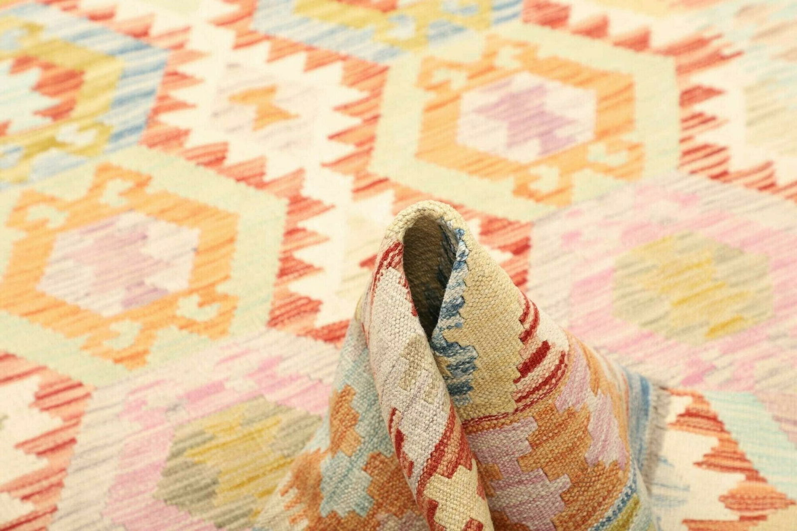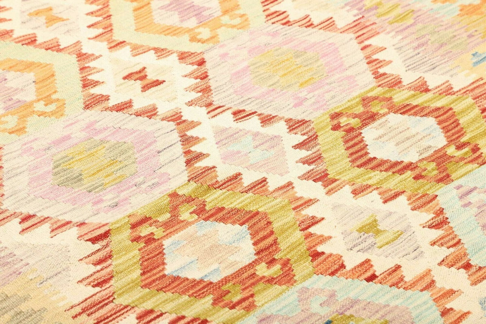 Ein weiterer Vorteil unseres handgewebten Kelim Teppichs ist seine Pflegeleichtigkeit. Die Schurwolle ist schmutzabweisend und benötigt nur minimale Pflege, um ihre optimale Qualität zu erhalten. Regelmäßiges Staubsaugen reicht in der Regel aus, um die Frische des Teppichs zu bewahren. Zudem ist die Wolle von Natur aus flammhemmend, was einen zusätzlichen Sicherheitsschritt in Ihrem Zuhause darstellt.