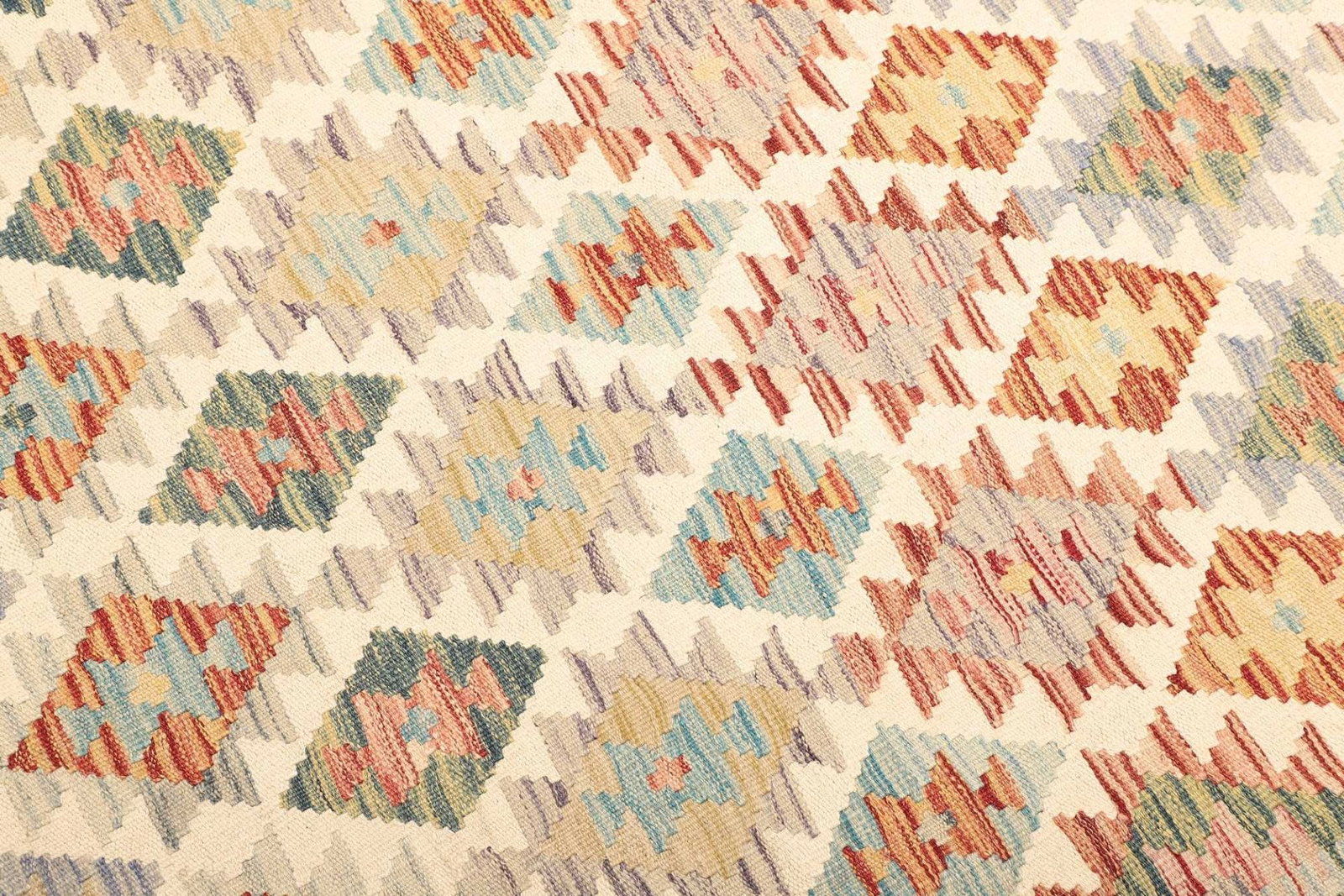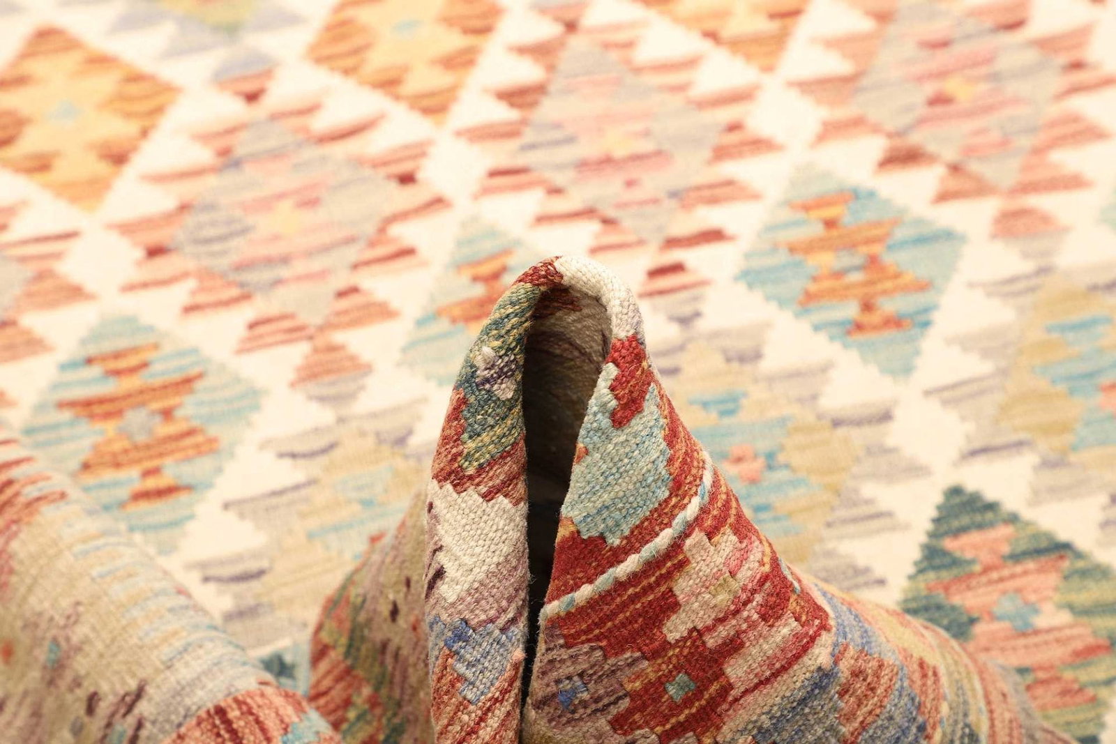 Der Kelim Teppich ist aus 100 % Wolle gefertigt, einem natürlichen Material, das für seine Langlebigkeit und Robustheit bekannt ist. Wolle hat die Fähigkeit, Wärme zu regulieren und Feuchtigkeit abzuleiten, was den Teppich sowohl im Winter als auch im Sommer angenehm macht. Die handgewebte Technik verleiht dem Teppich nicht nur ein einzigartiges Aussehen, sondern sorgt auch für eine hohe Knotendichte. Dies bedeutet, dass jeder Kelim Teppich mit großer Sorgfalt und Liebe zum Detail gefertigt wurde, was seine Exklusivität unterstreicht.